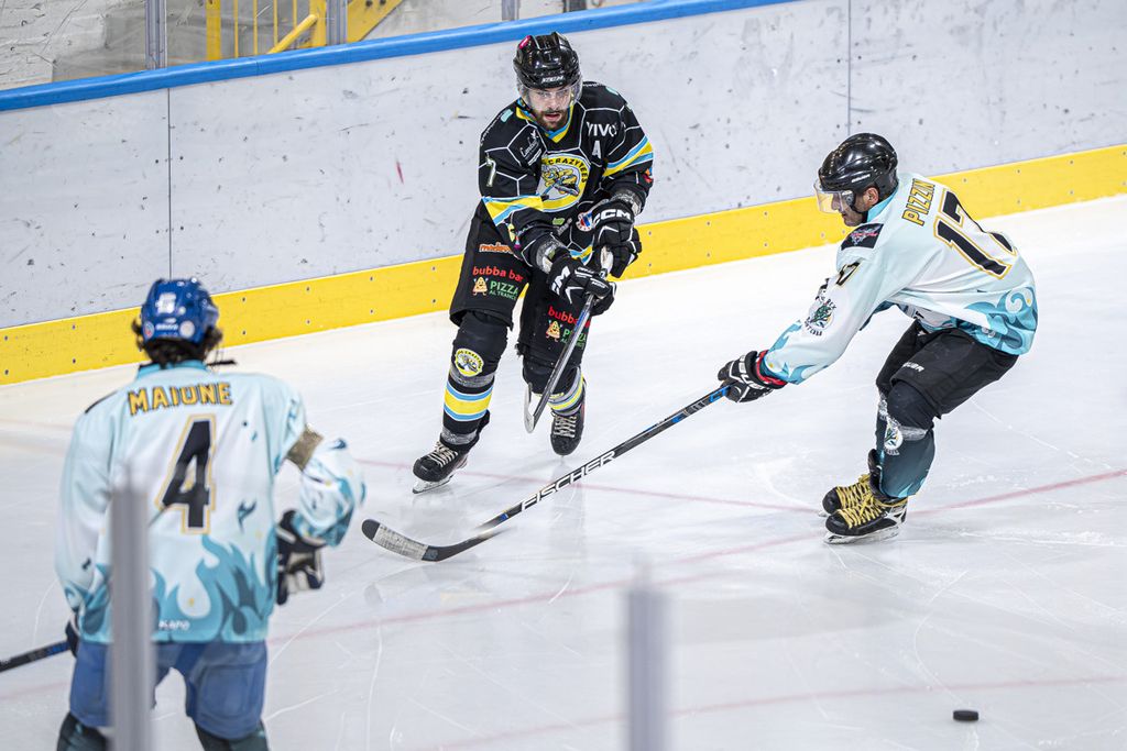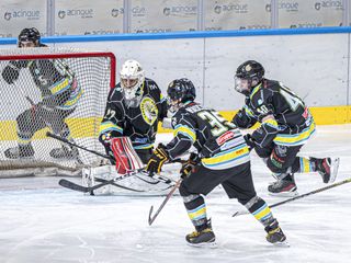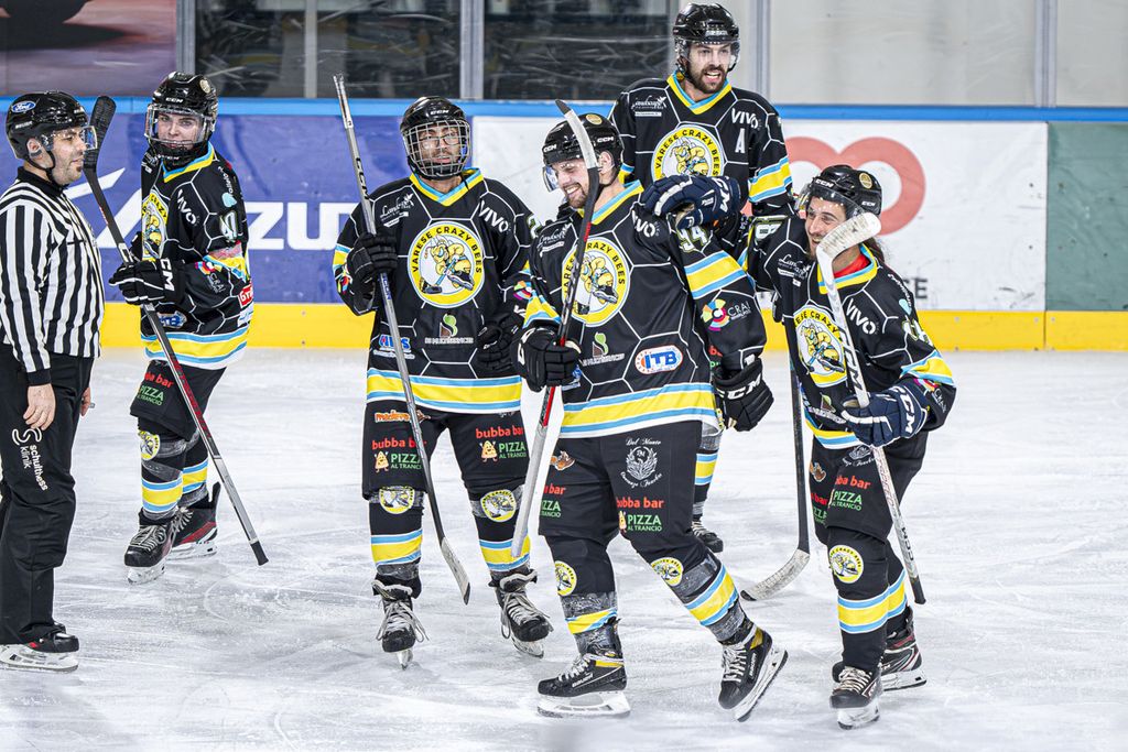 Crazy Bees ancora vincenti con scorpacciata di gol nella divisione B contro gli Ice Rex Pontebba all'Acinque Ice Arena (è finita 16-1 contro una squadra che è al primo anno in categoria con 7 gol di Omar Garbuio, 2 di Omar Cagnina che è stato designato anche Mvp, con premio offerto dal Madera Pub del palaghiaccio) in un match targato Toyota C-HR Novauto, con tanto di giro di pista dell'auto e gadget. In categoria C terza vittoria dell'Academy sui sui Diavoli Rossoneri per 7-1. Sabato 14 alle 19.20 a Varese (ingresso gratuito) andrà in scena la partita dell'anno della divisione A tra i Crazy e l'Aosta che un anno fa vinse la gara decisiva nelle finali proprio in via Albani: ci sarà spettacolo sul ghiaccio e fuori, con eventi speciali e gadget. Riviviamo intanto l'ultima vittoria grazie alle foto di Michele Del Re.