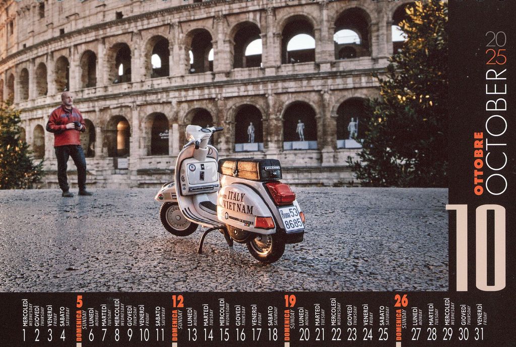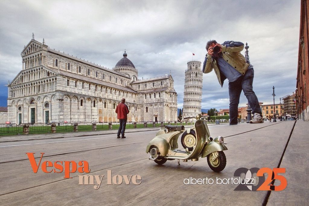 «Chi Vespa mangia le mele», recitava uno slogan del tempo, e Alberto ne deve aver fatto indigestione - se non altro di chilometri - per regalarci un piccolo capolavoro di ironia e tecnica fotografica che incomincia a stuzzicarci fina dalla copertina, con la Vespa “6 Giorni” del 1951 parcheggiata nella Piazza dei Miracoli di Pisa, con il Bortoluzzi miniaturizzato che contempla la Torre e un turista vero a grandezza naturale a scattare una fotografia al gioiellino della Piaggio. E come sempre accade, nemmeno il nostro fotografo è profeta in patria, i migliori complimenti per l’opera vespistica gli sono arrivati da un mostro sacro del cinema francese, Patrice Leconte che, ricevuto in dono “Vespa my love”, gli ha scritto: «Il calendario 2025 è appena arrivato. È molto bello. Tutte queste Vespe mi fanno sognare. Grazie per la tua lealtà, la tua amicizia e il tuo talento». C’è di che montare in Vespa e andare a Parigi ad ambientare davanti alla Tour Eiffel il primo scatto per l’anno 2026.