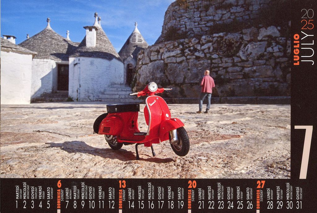 Tanta luce e i pinnacoli dei trulli di Alberobello in un luglio affocato che solo la Vespa 75 del 1967 renderebbe più lieve, mentre al mare di Rimini, noblesse oblige, ci si va con la Vespa sidecar del 1955 alla ricerca di atmosfere tondelliane. Serve invece una particolare Vespa “Hoffmann” 125 del 1953 per valicare il Passo Sella in Trentino Alto Adige, mentre la storica 125 “Arcobaleno” del 1984 del compianto vespista giramondo Giorgio Bettinelli è parcheggiata, in ottobre, nientemeno che davanti al Colosseo.