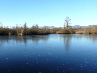 La luce è splendida, il cielo terso, l’aria ha quel bel frizzantino invernale che punge senza far male, qua e là nel sentiero ci sono pozze ghiacciate simili a quadri astratti, il canale Brabbia è in asciutta ma un po’ d’acqua scorre donando ancora il verde alle bordure. Ecco in lontananza la “risata” del picchio verde, mi inoltro verso il primo “chiaro”, lo stagno dove di solito sguazzano le nutrie e qualche airone cenerino sonnecchia tra le canne. È completamente ghiacciato, e il blu riflesso del cielo lo riveste di mille sfumature. Non c’è anima viva in giro, spio le cinciallegre e le cince bigie che vanno a rifornirsi nelle mangiatoie, arriva anche un picchio muratore, il silenzio è assoluto, non passa nemmeno un aereo, cielo e terra, il giallo paglia del canneto e qualche ontano nero che si china verso l’acqua.
