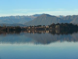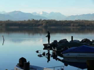 Nel porticciolo di Cazzago ritrovo il Monte Rosa, circonfuso da toni di colore che non avrebbero stonato in un quadro di Vittore Grubicy, c’è un pescator di canna solitario e una manciata di persone venute forse qui a smaltire il panettone, due passi e ritorno a casa, magari per la tombola.