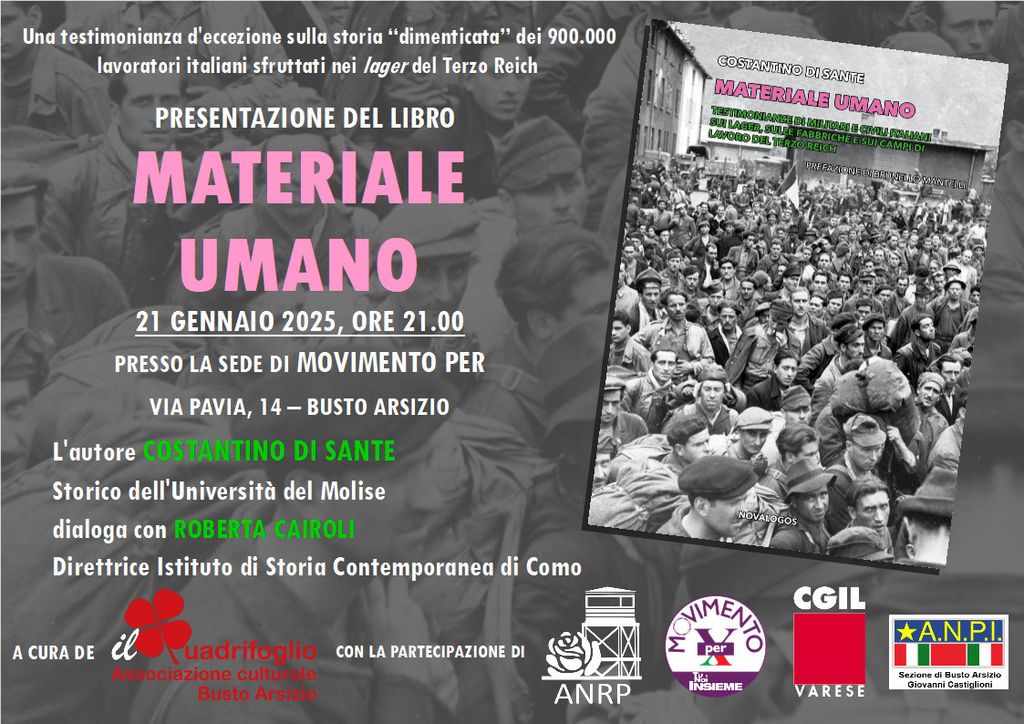 Martedì 21 gennaio, alle ore 21:00, presso la sede di “Movimento Per” in via Pavia a Busto Arsizio, si terrà la presentazione del libro “Materiale Umano”. L'autore, Costantino di Sante, storico dell'Università del Molise, racconterà attraverso le testimonianze di militari e civili italiani la tragica realtà dei lager, delle fabbriche e dei campi di lavoro del Terzo Reich.
