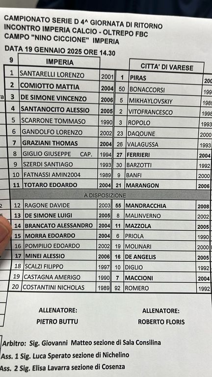 Imperia (4-2-3-1): Santarelli, Comiotto, Gandolfo, Scarrone, Vincenzo De Simone (Minei 36' st); Santanocito, Giglio; Graziani (Luigi De Simone 31' st), Fatnassi (Costantini 28' st), Totaro (Scalzi 16' st); Szerdi (Castagna 47' st). A disp.: Ragone, Brancato, Morra, Pompilio. Allenatore: Pietro Buttu.