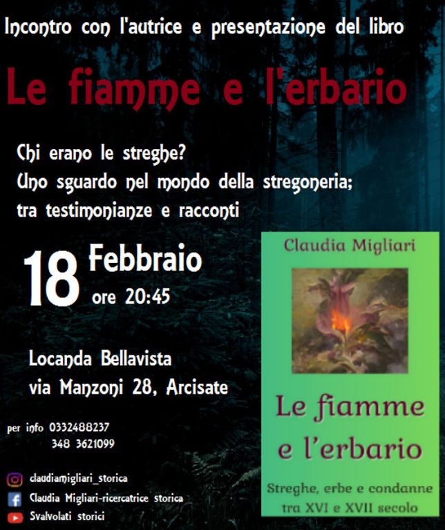 Il 18 febbraio, alla Locanda Bellavista di Arcisate, si proverà a rispondere a queste e tante altre domande in una serata dedicata alla figura della strega. La ricercatrice storica e autrice, Claudia Migliari, presenterà il proprio libro “Le fiamme e l'erbario”; un'occasione per scoprire un argomento che da sempre attira la curiosità e l'interesse, attraverso documenti storici, testimonianze, verbali dei processi e leggende che affondano le radici nel folklore e nei racconti tramandati nei secoli.