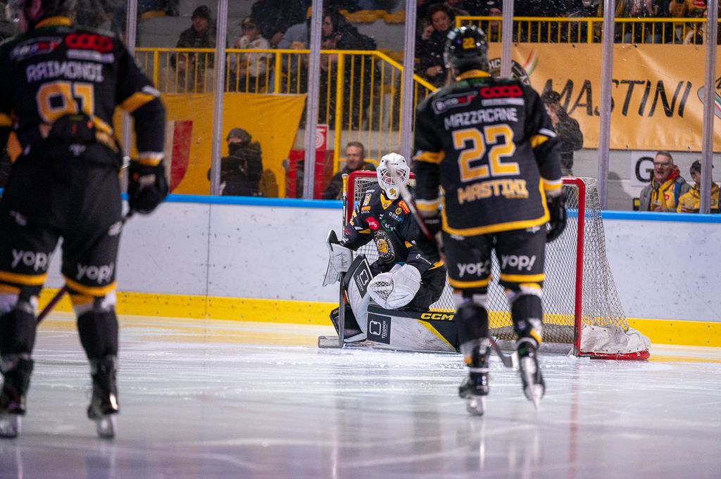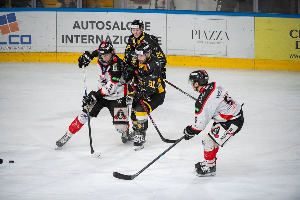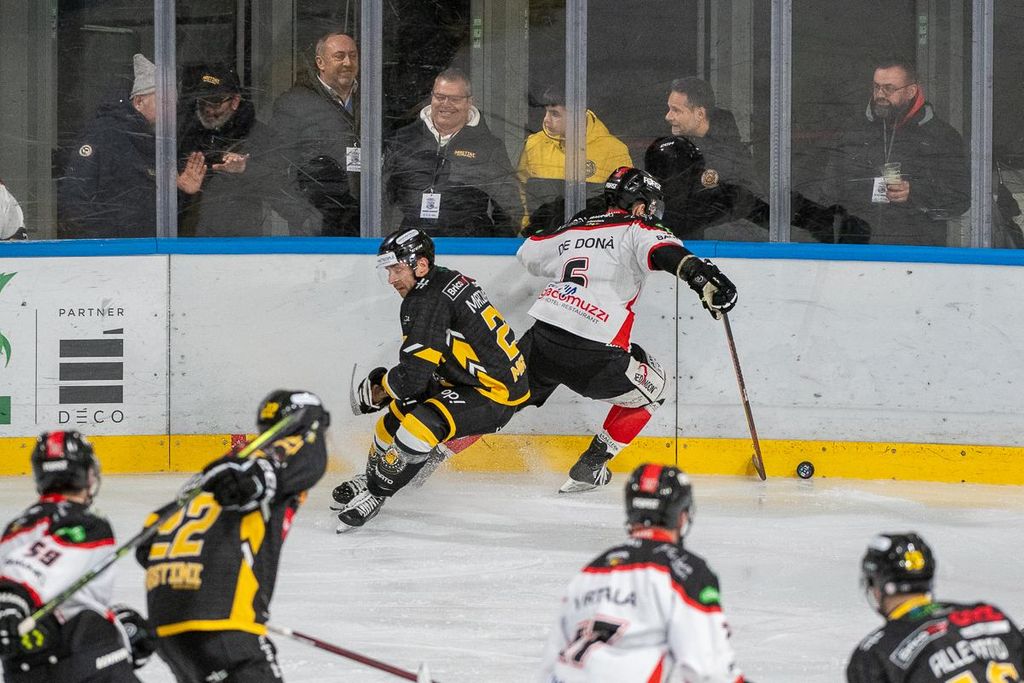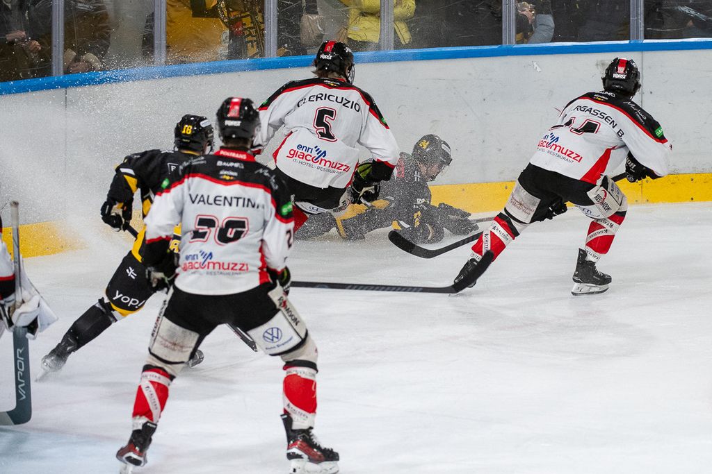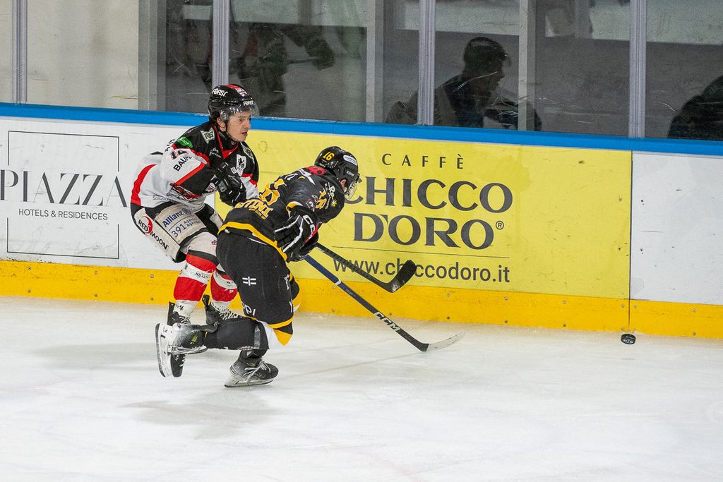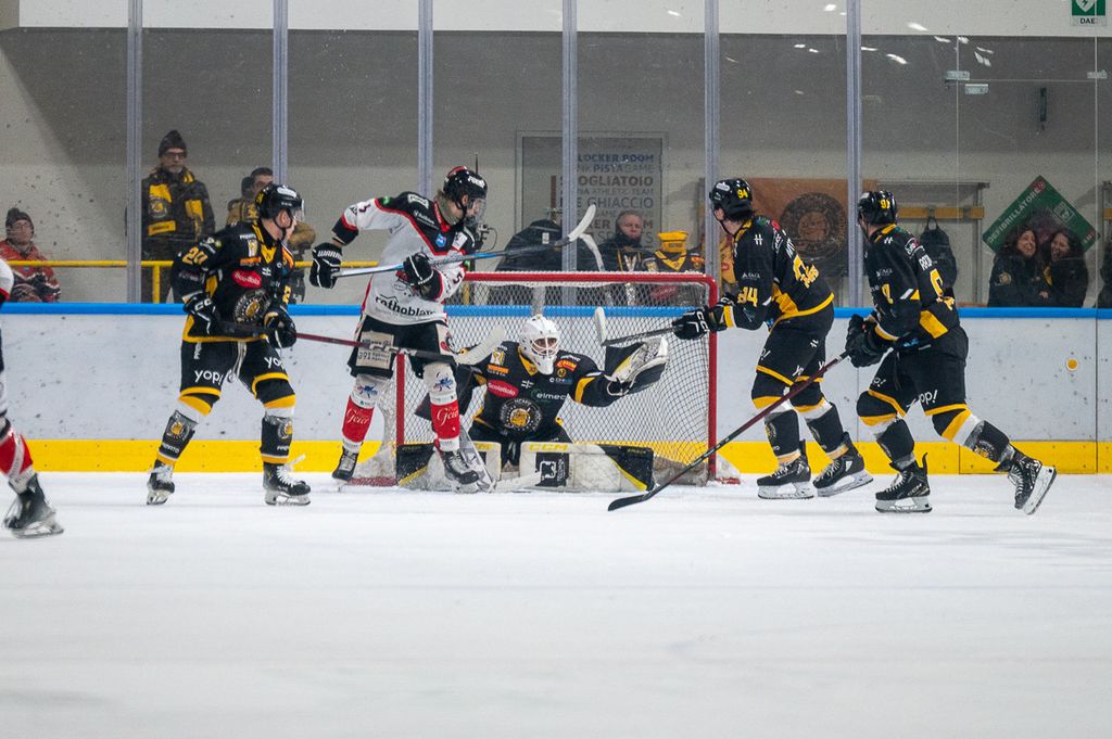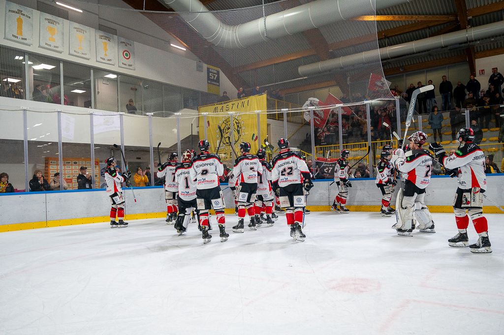 Partita in cassaforte già nel primo drittel, finito 3-0 con i gol di Moritz, De Dona' e Oberrauch. Disastro addirittura peggiore nel secondo periodo: a segno, sempre nella stessa porta, Andergassen, Felderer (doppietta) e ancora Oberrauch. Sfamate le loro fauci, gli altoatesini concedono il gol della bandiera a Kuronen, nel terzo tempo.