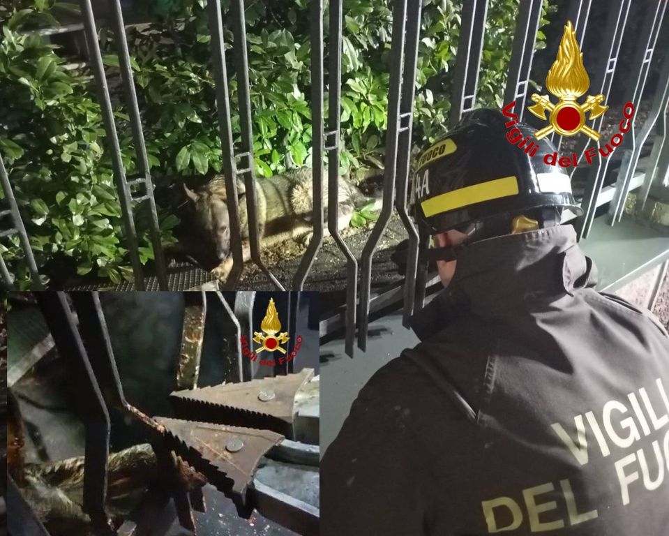 Un cagnolone con la zampa incastrata nella recinzione di casa è stato soccorso e liberato dai vigili del fuoco di Busto Arsizio-Gallarate.