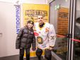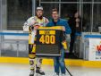 Erik Mazzacane omaggiato sugli spalti da uno straordinario omaggio con le sue foto e le sue 400 partite in giallonero e, poi, sul ghiaccio con la maglia speciale consegnata dal presidente Carlo Bino (foto Alessandro Umberto Galbiati)