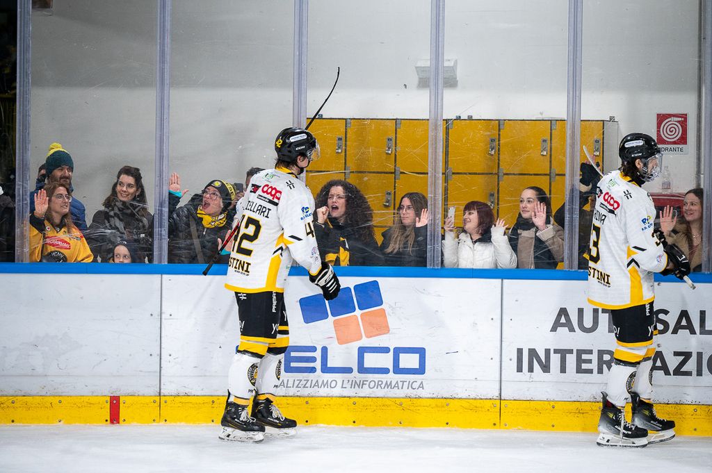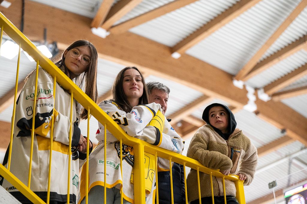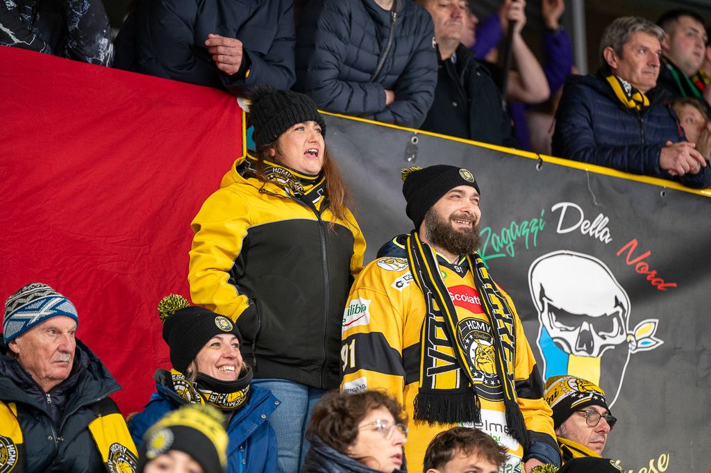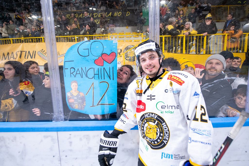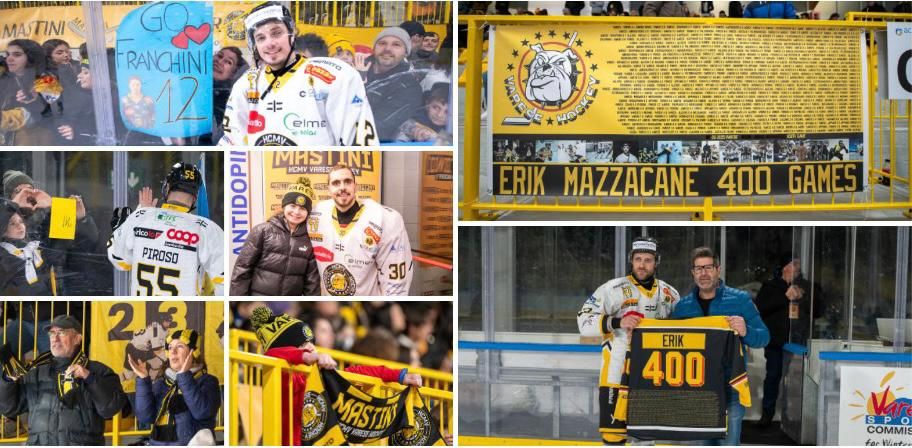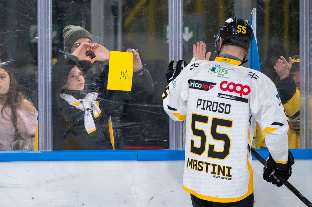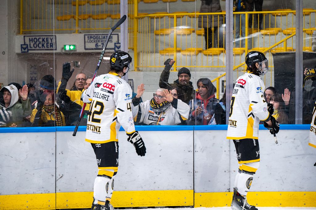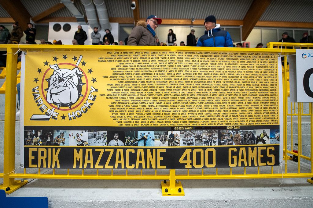Erik Mazzacane omaggiato sugli spalti da uno straordinario omaggio con le sue foto e le sue 400 partite in giallonero e, poi, sul ghiaccio con la maglia speciale consegnata dal presidente Carlo Bino (foto Alessandro Umberto Galbiati)