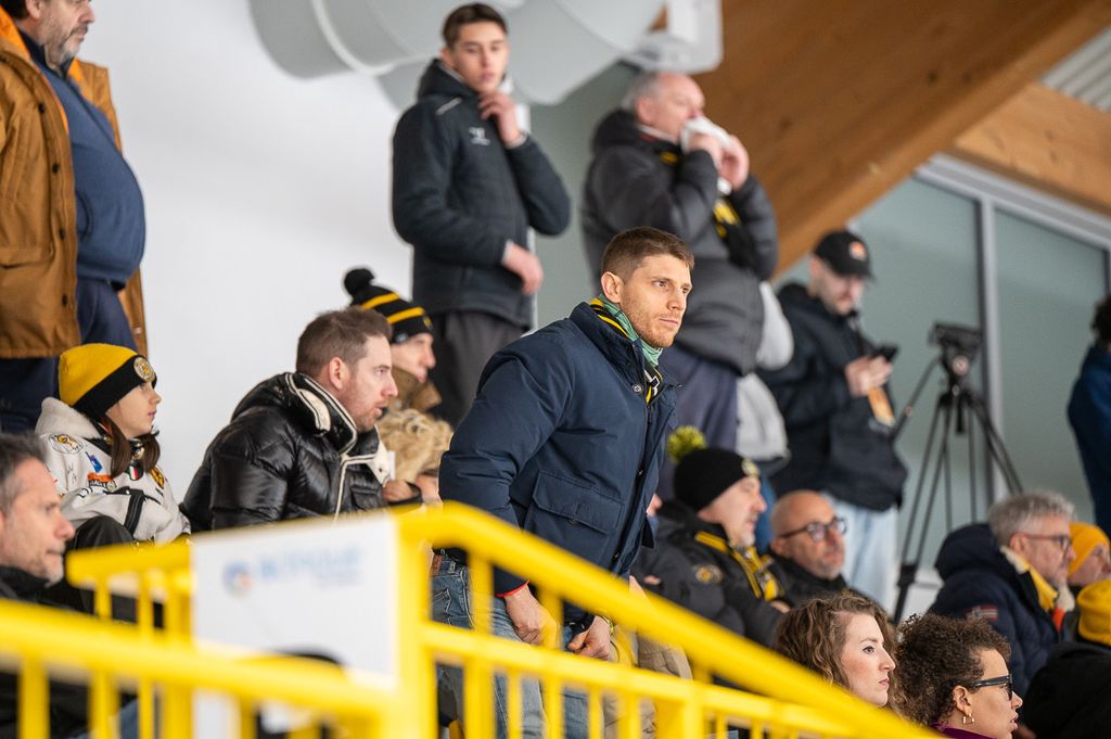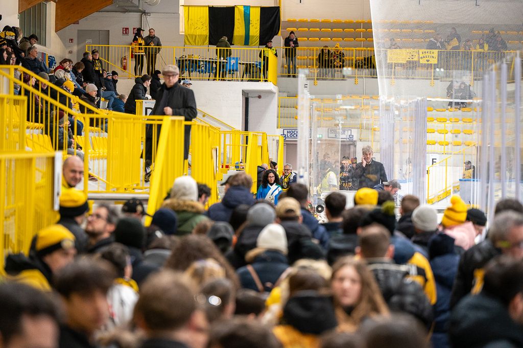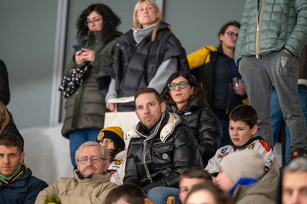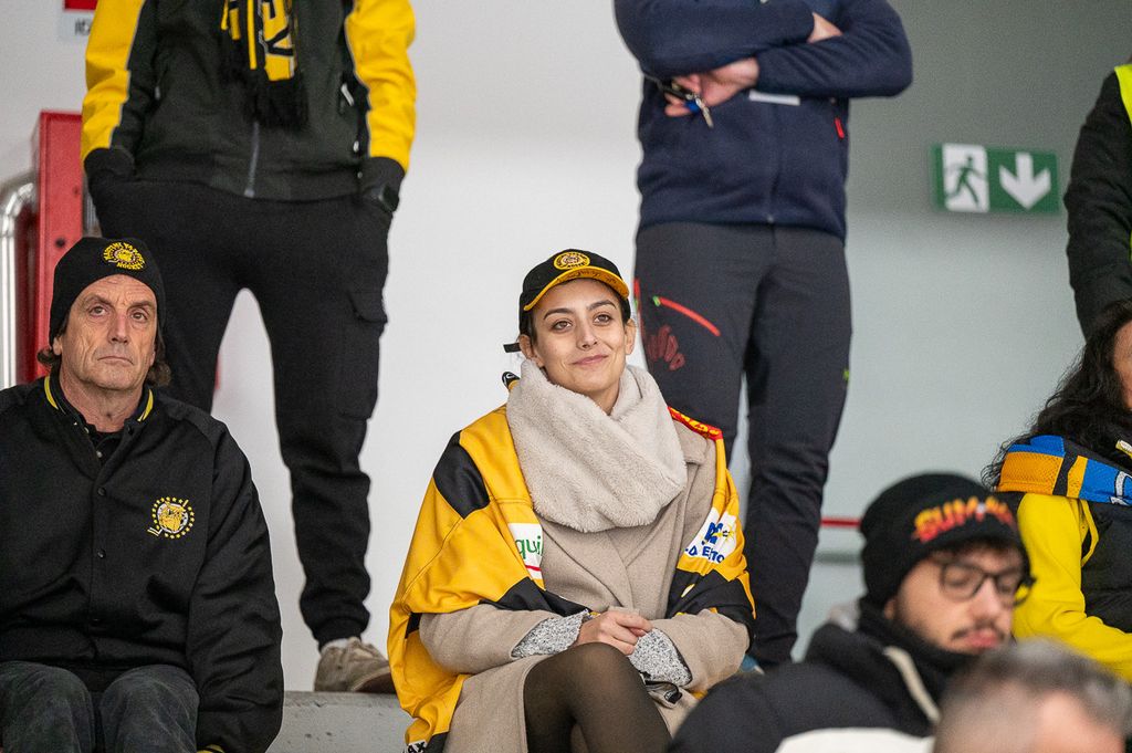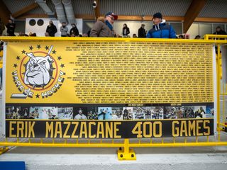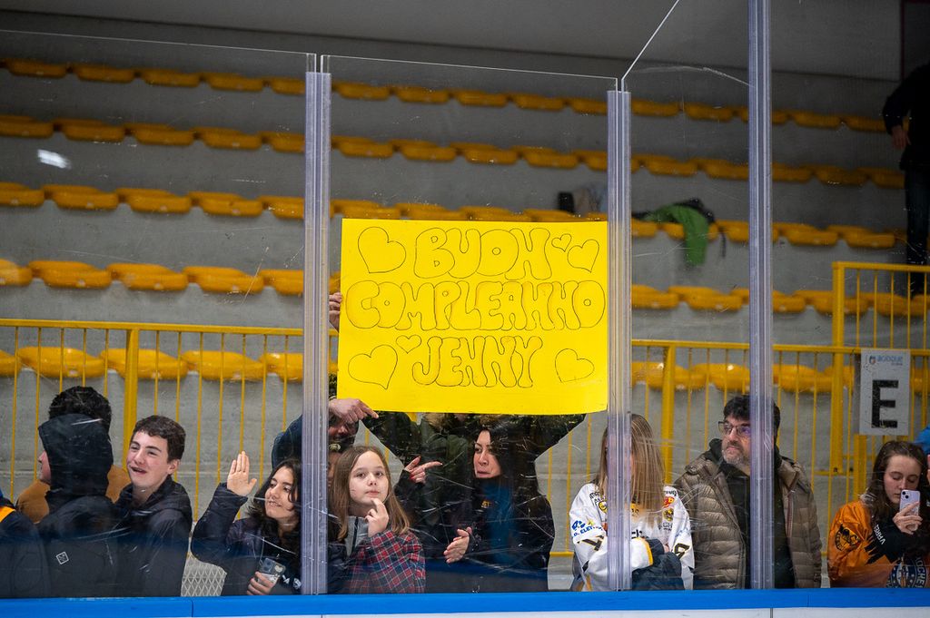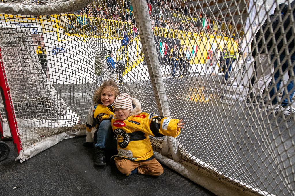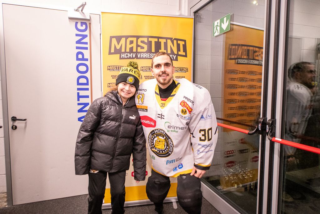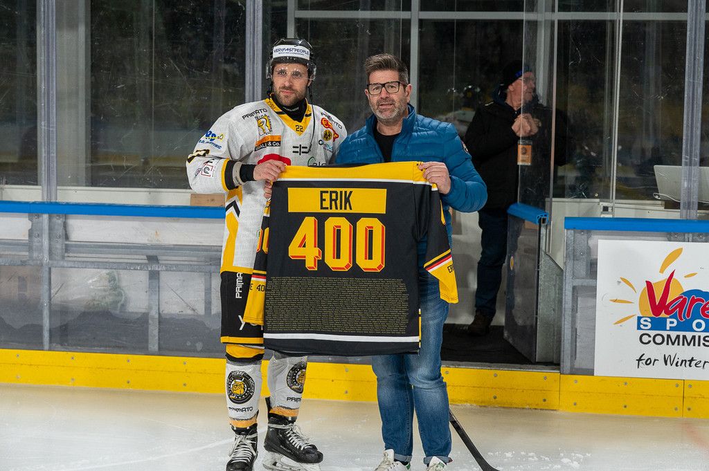 Erik Mazzacane omaggiato sugli spalti da uno straordinario omaggio con le sue foto e le sue 400 partite in giallonero e, poi, sul ghiaccio con la maglia speciale consegnata dal presidente Carlo Bino (foto Alessandro Umberto Galbiati)