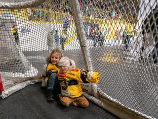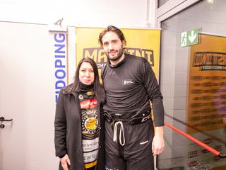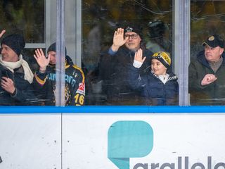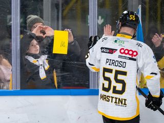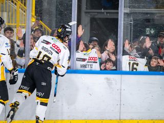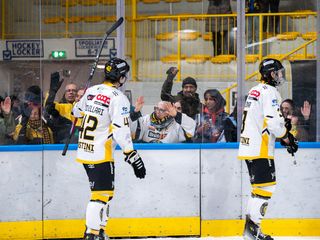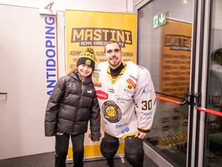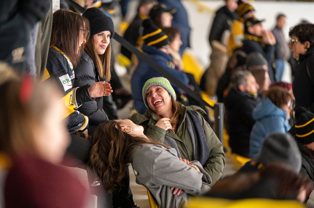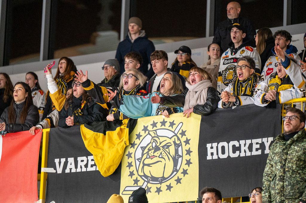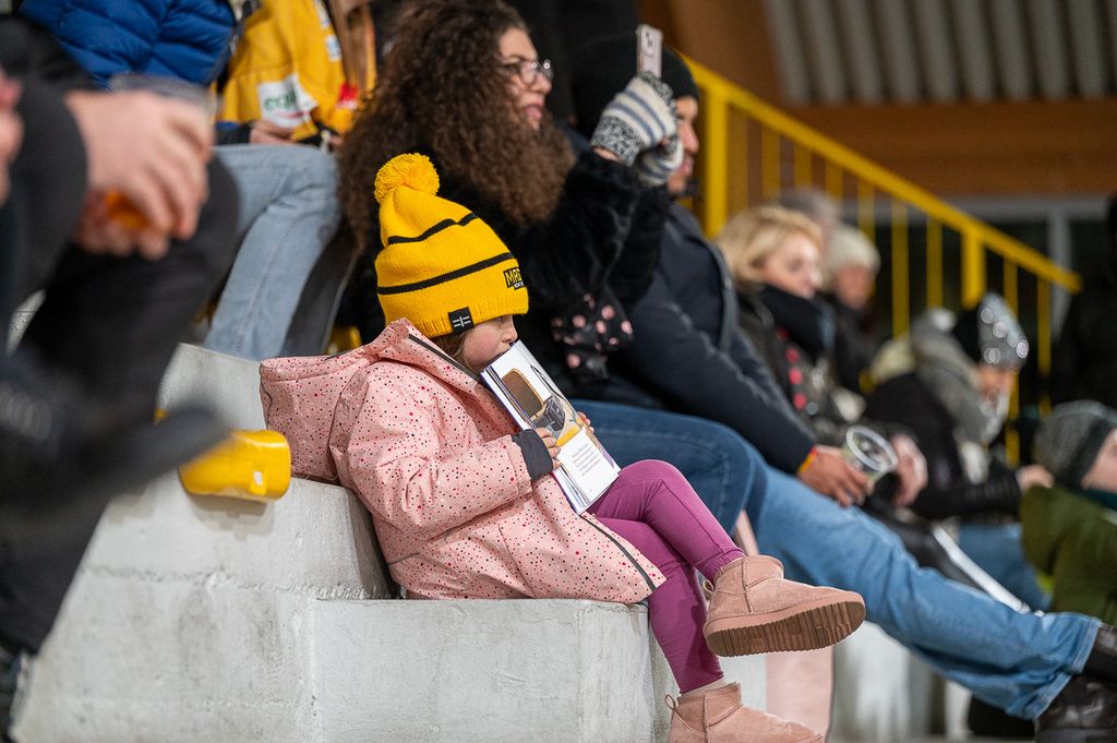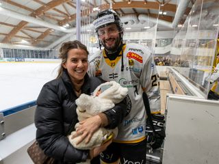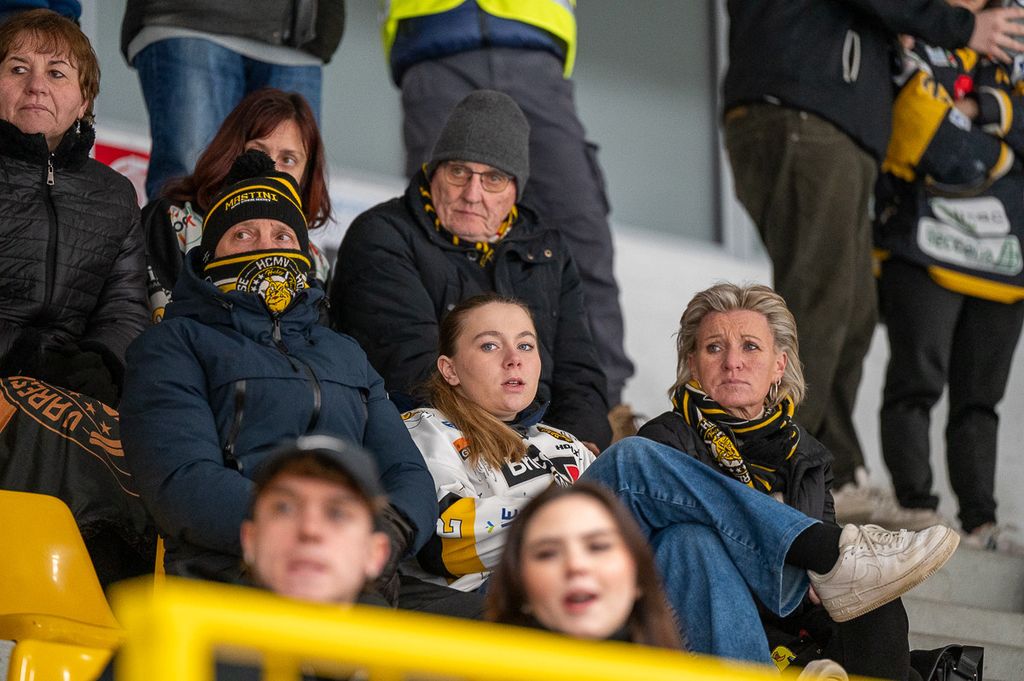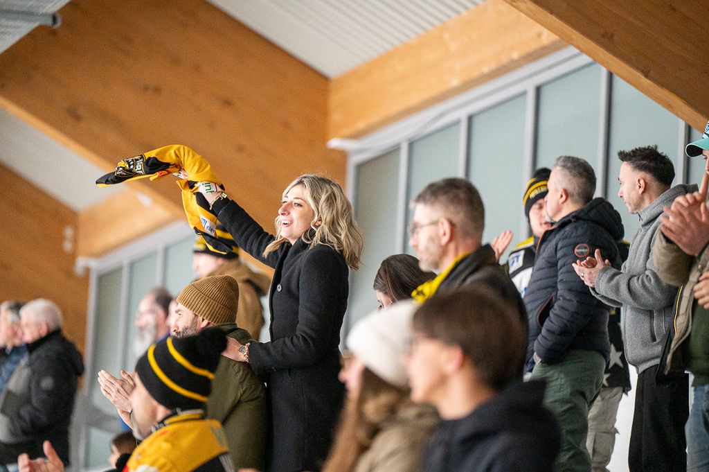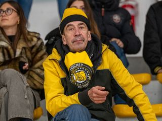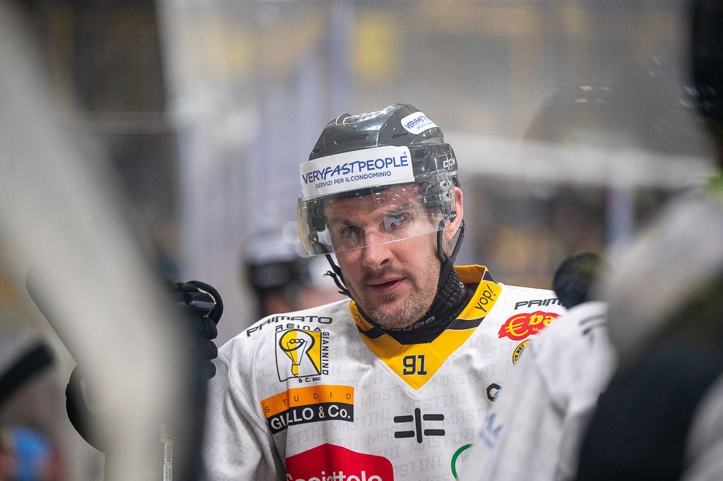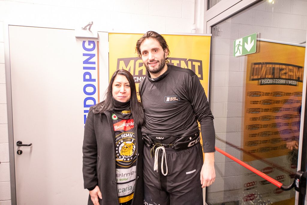 Erik Mazzacane omaggiato sugli spalti da uno straordinario omaggio con le sue foto e le sue 400 partite in giallonero e, poi, sul ghiaccio con la maglia speciale consegnata dal presidente Carlo Bino (foto Alessandro Umberto Galbiati)