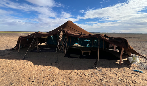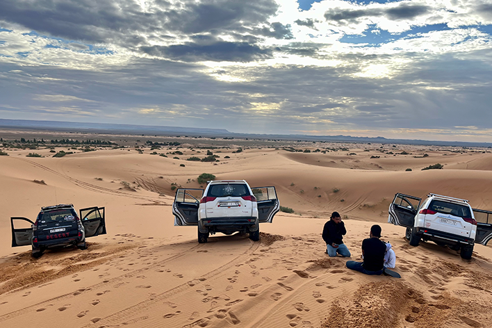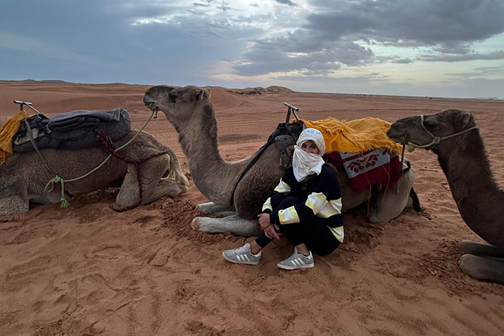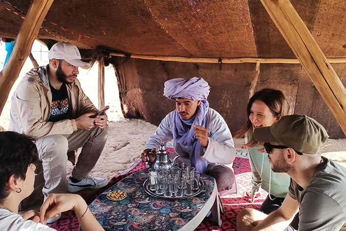 Nel tardo pomeriggio siamo finalmente arrivati a Merzouga, la porta del Sahara. Abbiamo lasciato il pulmino e siamo saliti sui dromedari, iniziando la traversata tra le dune di Erg Chebbi. Il tramonto ha trasformato la sabbia in un mare di sfumature arancioni e dorate, mentre il silenzio assoluto del deserto ci avvolgeva. Dopo una cena berbera squisita, la serata è proseguita con una festa intorno al fuoco. I tamburi hanno iniziato a suonare, i musicisti hanno intonato canti tradizionali e in pochi minuti ci siamo ritrovati a battere le mani e a ballare sotto il cielo stellato. Abbiamo riso, cantato e ci siamo lasciati trasportare dal ritmo ipnotico della musica Gnawa, prima di ritirarci nelle nostre tende, cullati dalla magia del deserto. Il mattino dopo, sveglia presto per ammirare l’alba sulle dune; il cielo, inizialmente scuro, si è pian piano illuminato di sfumature rosa e dorate, mentre il sole spuntava all’orizzonte. Il silenzio era assoluto, rotto solo dal vento che accarezzava la sabbia. Dopo aver fatto colazione nel campo, ci attendeva l’ultima avventura in 4x4. Saliti a bordo, abbiamo saltato sulle dune, fermandoci in un piccolo villaggio nomade. Qui, abbiamo incontrato famiglie che vivono ancora secondo le tradizioni del deserto, accogliendoci nelle loro tende, ci hanno offerto il tè e raccontato le loro storie. Una vita in viaggio, adattandosi alle difficili condizioni del Sahara! La loro esistenza, semplice ed autentica, mi ha ricordato quanto sia preziosa la connessione con la natura e con le proprie radici.