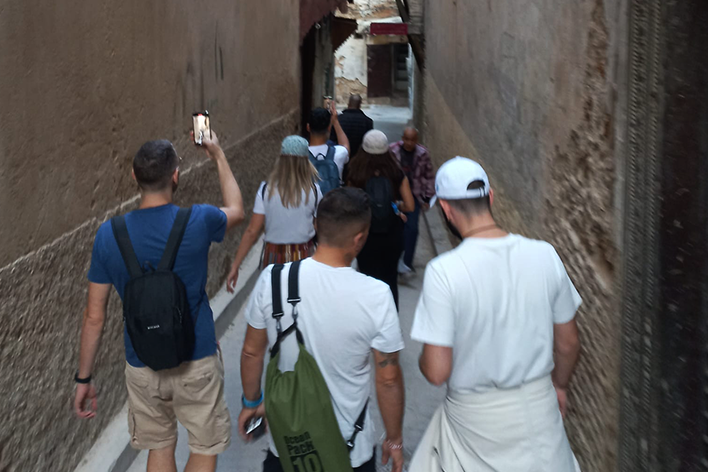 Dopo aver sorseggiato il famosissimo tè alla menta nella piazza centrale, siamo saliti sul nostro pulmino pronti per la prossima tappa del viaggio. Arrivati a Fes, ci ha accolto Louki, una guida locale incredibilmente spiritosa che ha arricchito la nostra visita con una buona dose d’ironia. Ci siamo addentrati nella Medina El-Bali, un labirinto di vicoli dove ogni angolo raccontava una storia. Abbiamo visitato la Madrasa Bou Inania, la Moschea Al-Qarawiyyin e, naturalmente, le celebri concerie di Chouara. Dall’alto delle terrazze, abbiamo ammirato gli uomini immersi nelle vasche di tintura, riempite di colori vivaci: rosso papavero, giallo zafferano, blu indaco. L’odore era forte, ma con un rametto di menta sotto il naso siamo riusciti a seguire l’opera degli artigiani; alcuni trattavano le pelli con sostanze naturali come calce ed escrementi di piccione per ammorbidirle. Un mestiere molto faticoso dalle origini antiche!