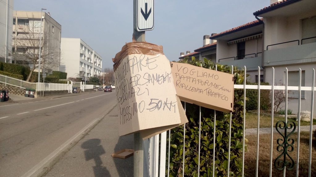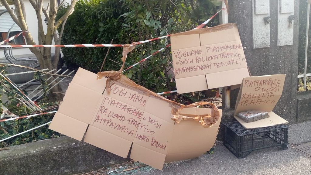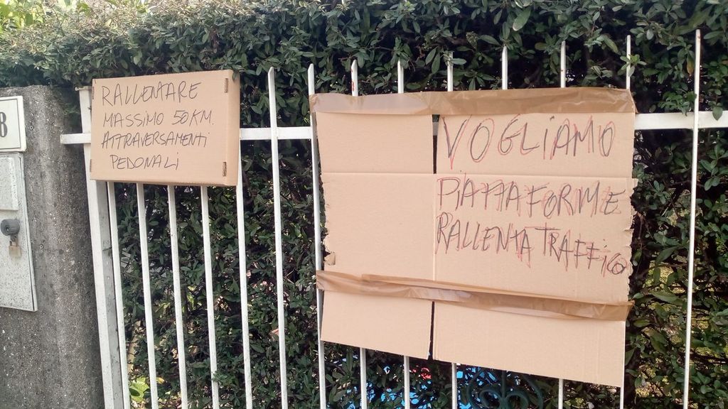 Vogliamo dossi e rallentamento traffico o Vogliamo piattaforme sono le scritte comparse e appese lungo via Rodari, in corrispondenza delle villette.