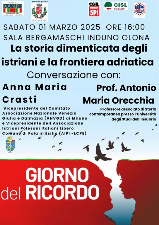 Il Coordinamento Anpi, sezione di Arcisate e di Induno Olona con le Acli di Induno Olona, la Cgil e la Cisl di Arcisate e con il patrocinio del comune di Induno Olona, promuovono, in occasione del Giorno del Ricordo, l’incontro La storia dimenticata degli istriani e la frontiera adriatica, che si terrà sabato 1° marzo alle 16 presso Sala Bergamaschi, in piazza Giovanni XXIII a Induno Olona.