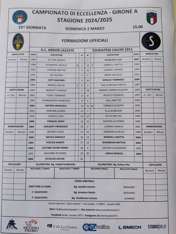 Solbiatese (3-5-2): Cavalleri; Lonardi L., Gabrielli, Monti; Minuzzi, Cocuz, Galli, Manfrè, Riceputi; Torraca, Silla. A disposizione: Seitaj, Scapinello, Lonardi D., Mondoni, Mongelli, Laraia, Giamberini, Lorusso. All. Grieco.