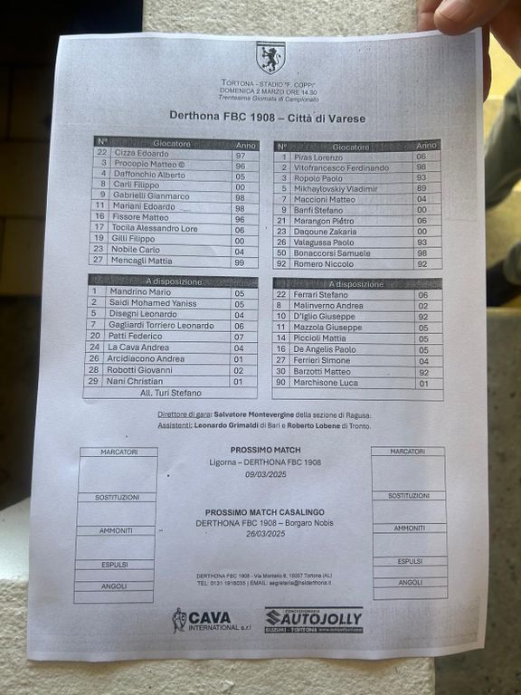Derthona (3-4-1-2): Cizza; Gilli, Fissore, Procopio; Daffonchio, Carli, Tocila, Nobile; Gabrielli (44′ st Robotti); Mariani (42′ st LaCava), Mencagli. A disp.: Mandrino, Saidi, Disegni, Gagliardi, Patti, Arcidiacono, Nani. All.: Stefano Turi.