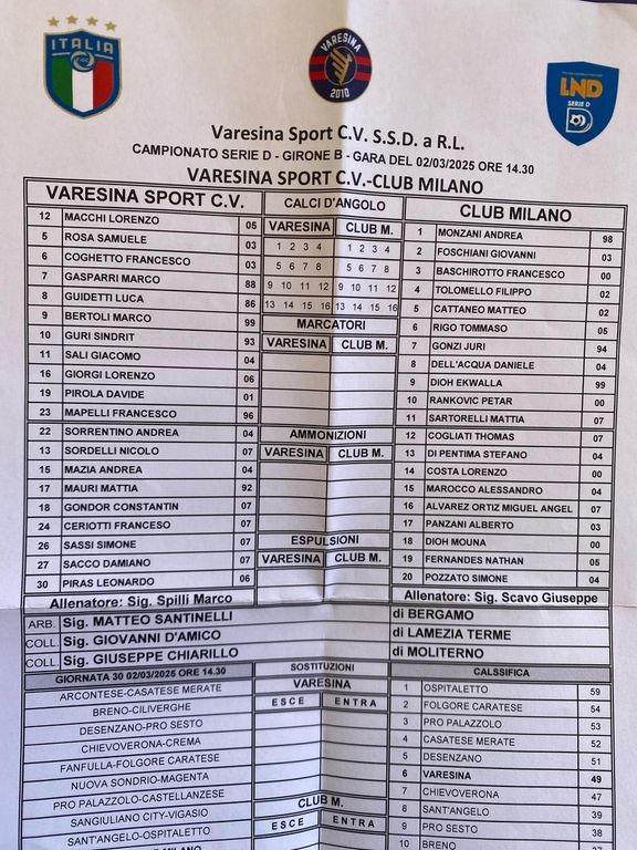 Seguiremo con aggiornamenti anche la sfida del girone B di Venegono dove è atteso un buon pubblico (entrano gratis i residenti dei comuni dove la Varesina ha i suoi centri sportivi e cioè Venegono Superiore, Venegono Inferiore, Vedano Olona, Cairate e Castiglione Olona): di fronte c'è il Club Milano, ostico e in grande rimonta dopo il ritorno in panchina di Scavo (23 punti in 13 gare), rossoblù di casa con molteplici assenze (Chironi, Caverzasi, Miconi, Argint, Gianola, Cosentino e Ghioldi, quest'ultimi squalificati; in panchina ci sono cinque 2007 e un 2006) ma con un attacco e un cuore capaci di tutto.