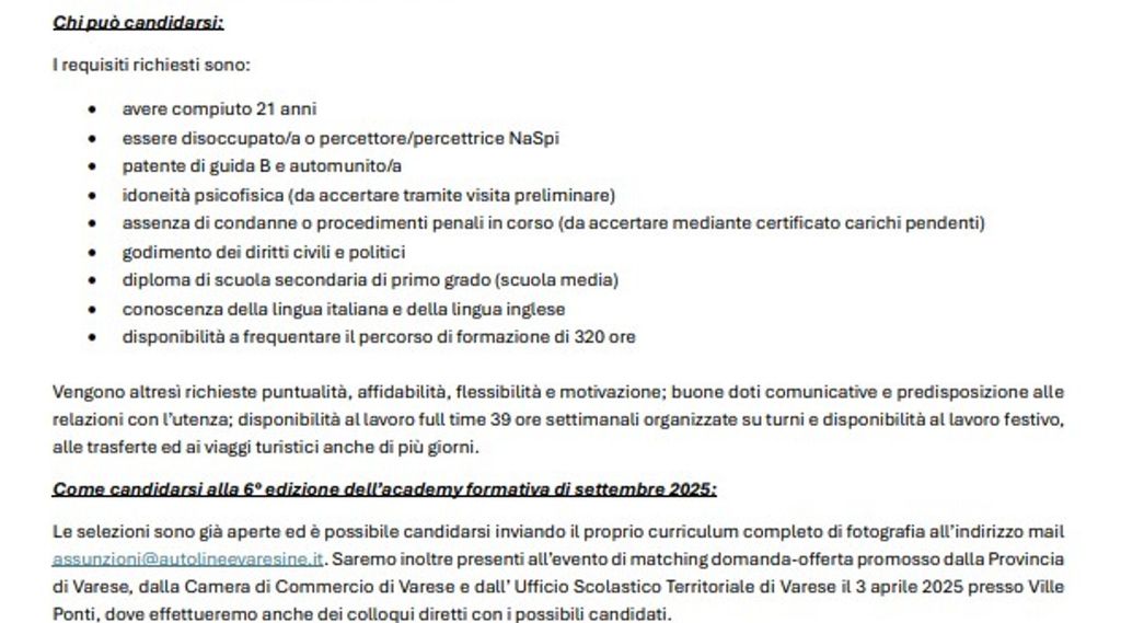 Le selezioni sono già aperte ed è possibile candidarsi inviando il proprio curriculum completo di fotografia all’indirizzo mail assunzioni@autolineevaresine.it.