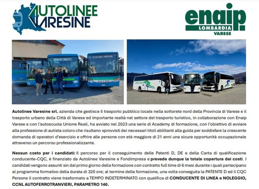 Oltre due anni dopo la prima sperimentazione, continua a rinnovarsi l’iniziativa di Autolinee Varesine per far conoscere la professione del conducente di autobus e per proporla a chi dimostra interesse verso tale mansione: se da poche settimane è partita la quinta edizione dell’Academy formativa, l’azienda sta già lavorando all’edizione numero 6, che avrà inizio a settembre nel solco della consueta collaborazione con Enaip Varese e Autoscuola UnioneReali.