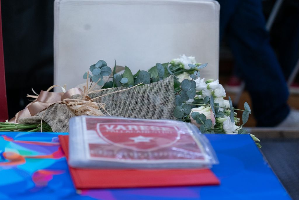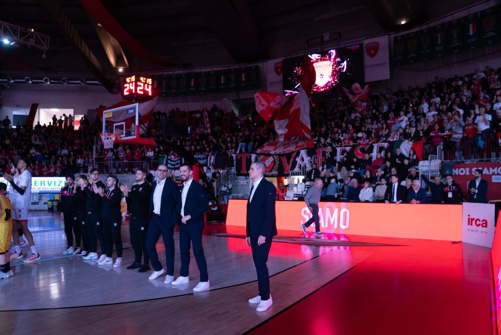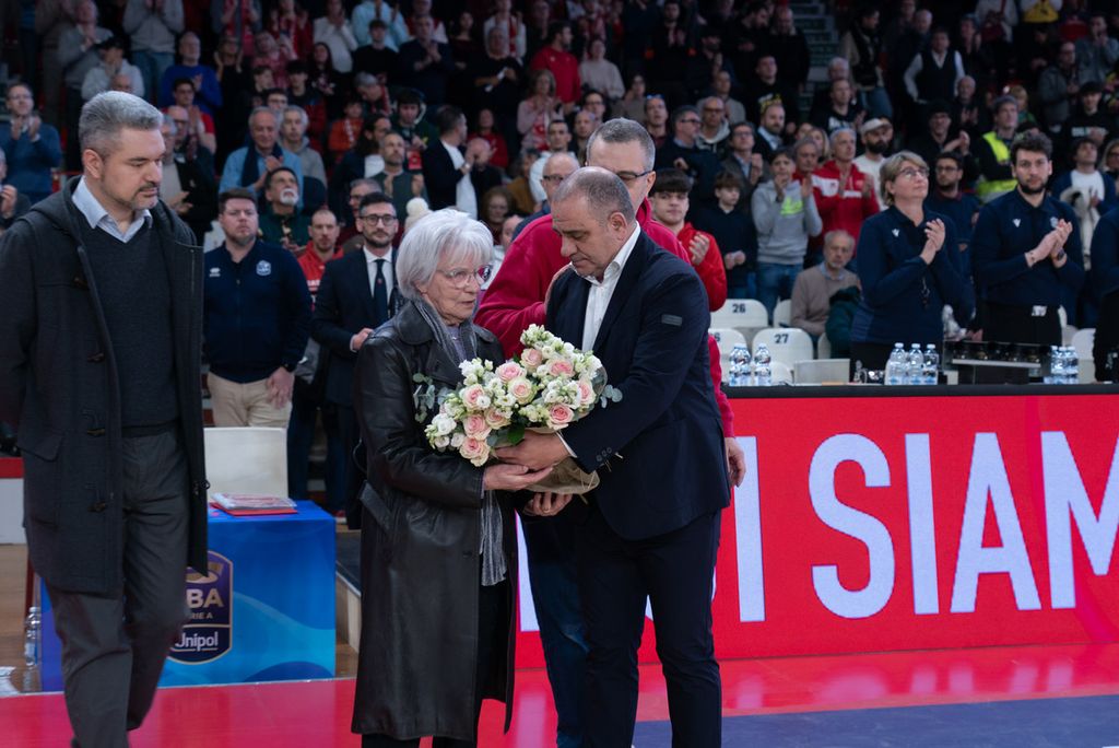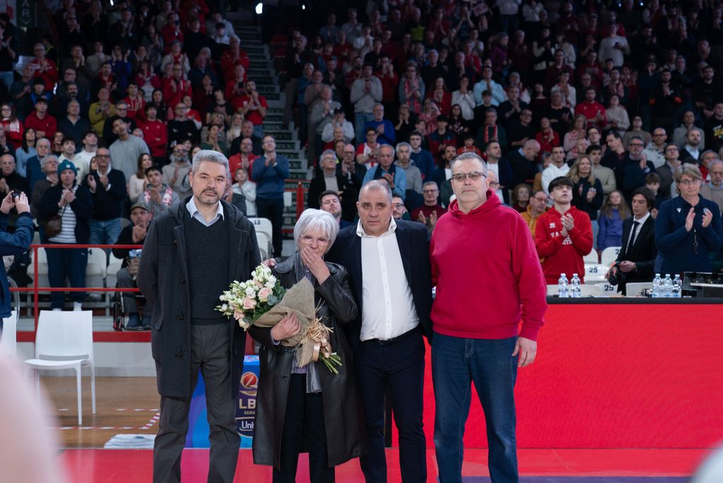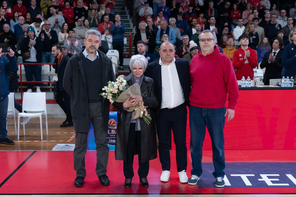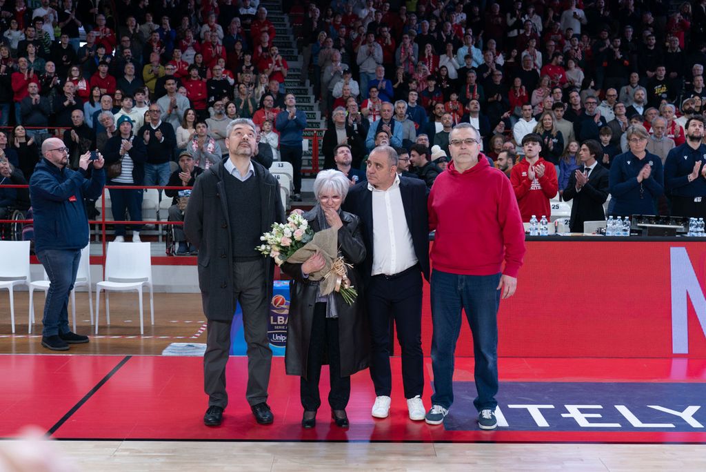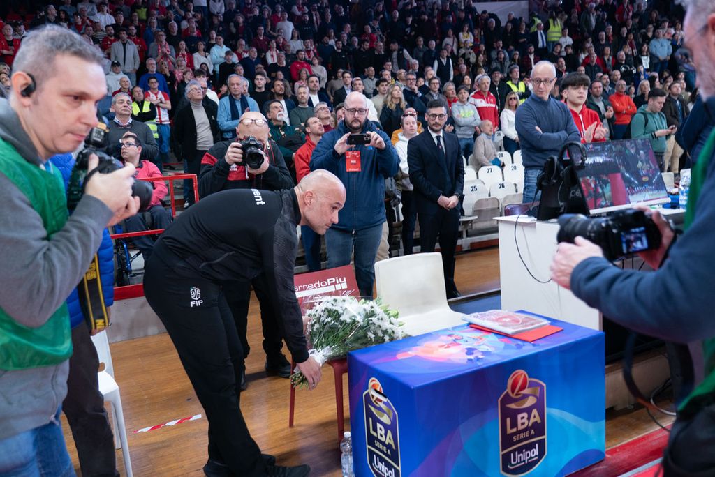 Prima del match, un lungo e sentito omaggio quello che il pubblico di Masnago ha riservato a Sandro Galleani, storico fisioterapista leggenda della società biancorossa scomparso, lo scorso 8 marzo. La vedova Egidia ha ricevuto un mazzo di fiori, posato poi sul posto da dove il marito era solito seguire le partite.