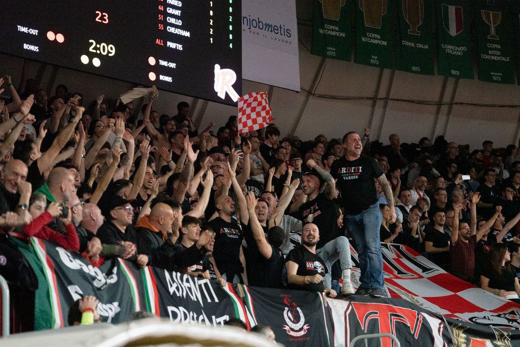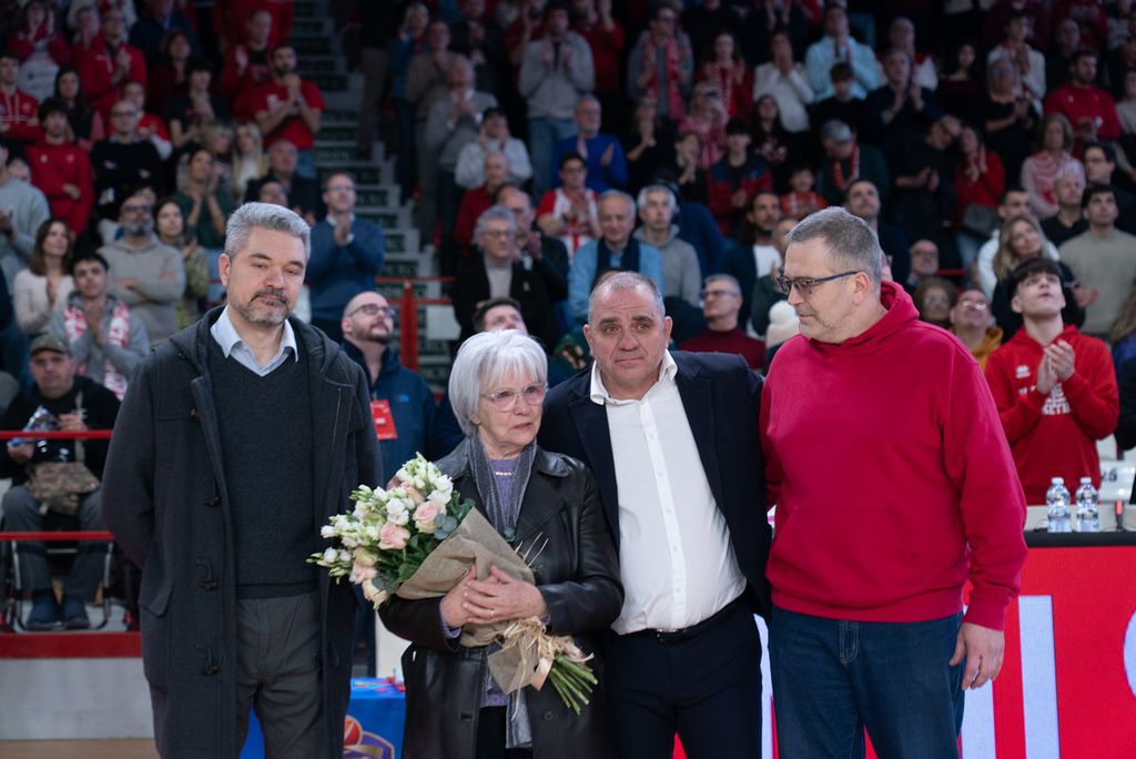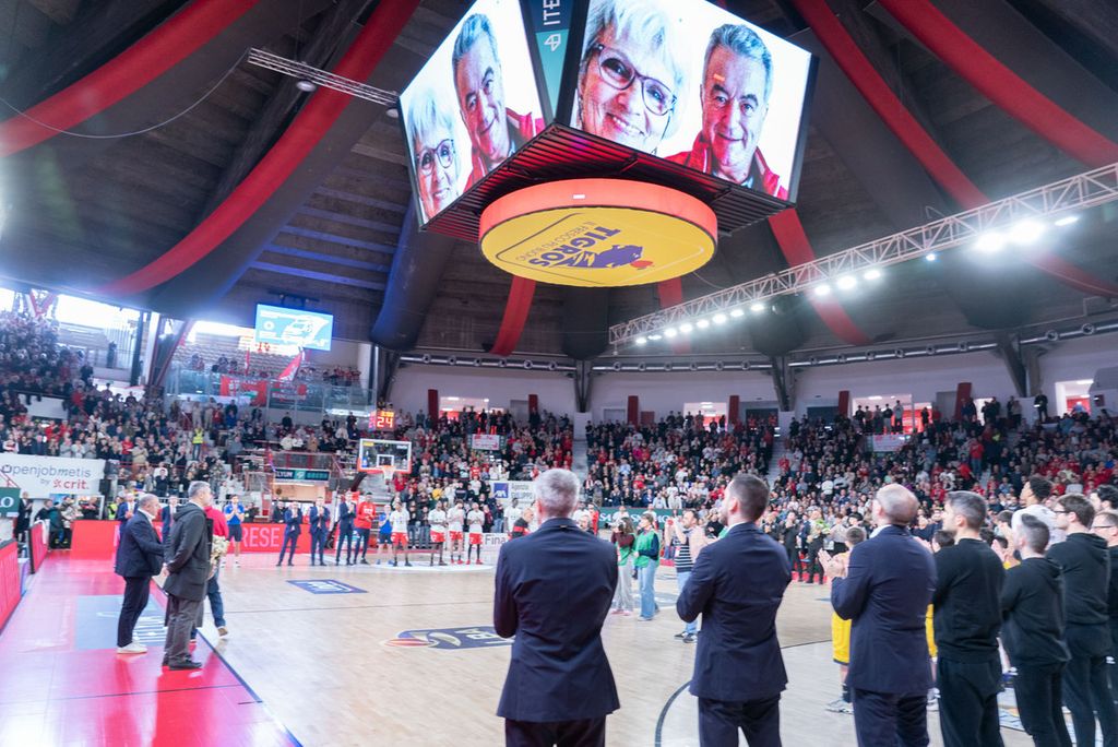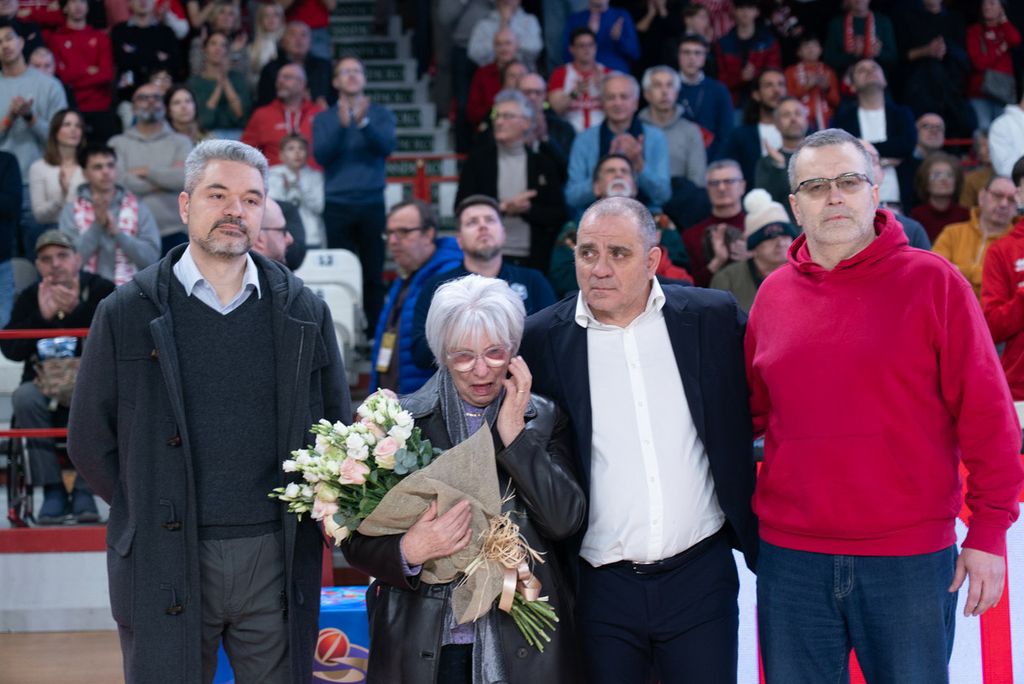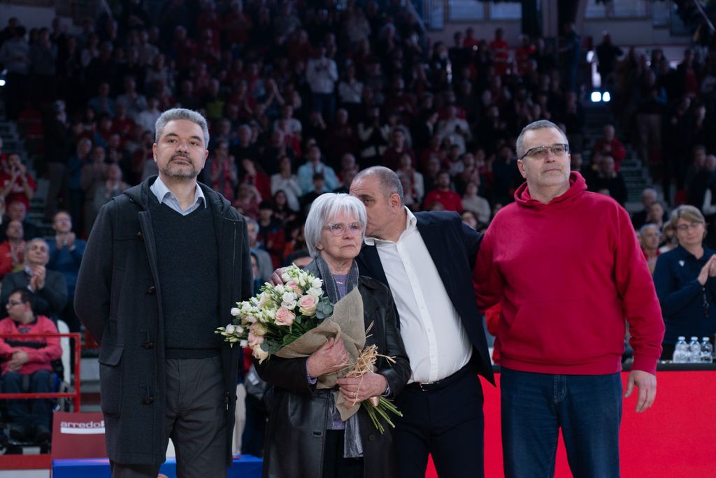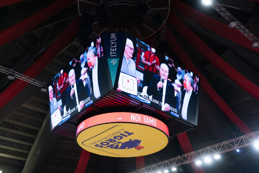 Prima del match, un lungo e sentito omaggio quello che il pubblico di Masnago ha riservato a Sandro Galleani, storico fisioterapista leggenda della società biancorossa scomparso, lo scorso 8 marzo. La vedova Egidia ha ricevuto un mazzo di fiori, posato poi sul posto da dove il marito era solito seguire le partite.