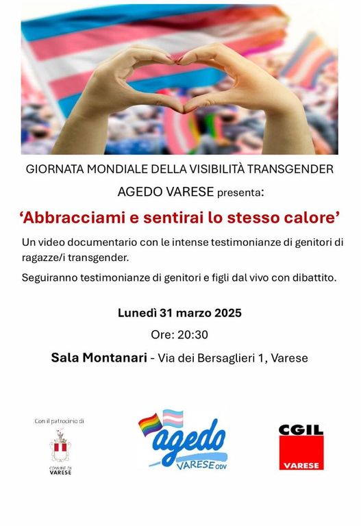 Vi aspettiamo a Varese con CGIL nella sala Montanari il 31 marzo alle 20,30 per la proiezione del video documentario con le intense testimonianze di genitori di ragazze/i transgender: Abbracciami e sentirai lo stesso calore.