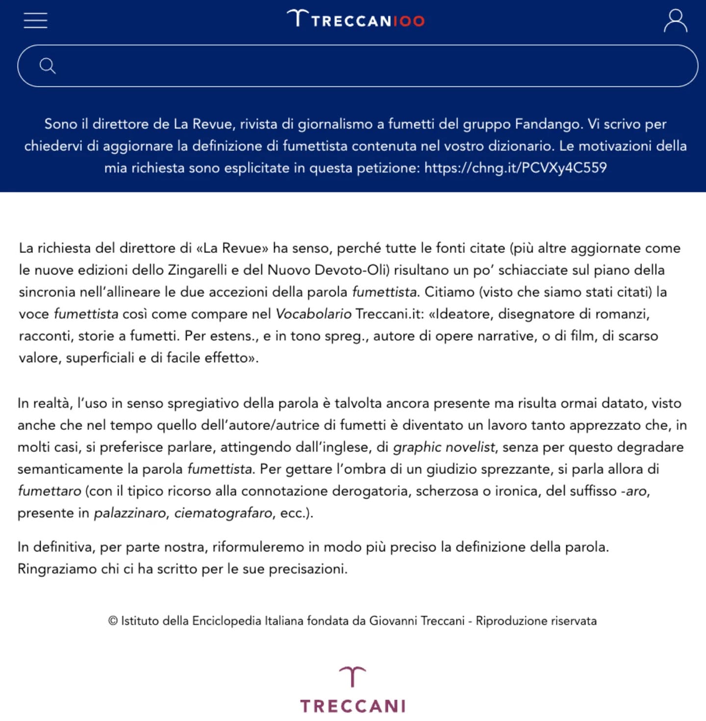 La petizione, che nel momento in cui scrivo conta circa 1250 firme, è stata lanciata nel novembre scorso. La prima a rispondere è stata proprio la Treccani.