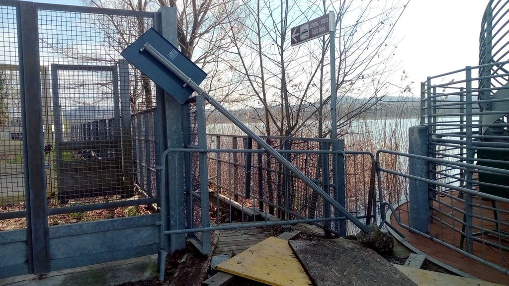 Le travi sono sollevate e spezzate e, in diverse parti, mancanti, lasciando il posto all'acqua del lago, come si evince chiaramente dalle foto che pubblichiamo.