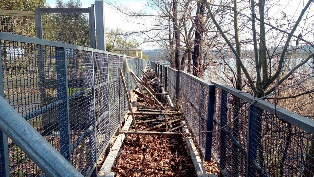 La passerella sulle rive del lago di Varese alla Schiranna sembra ormai abbandonata a se stessa.