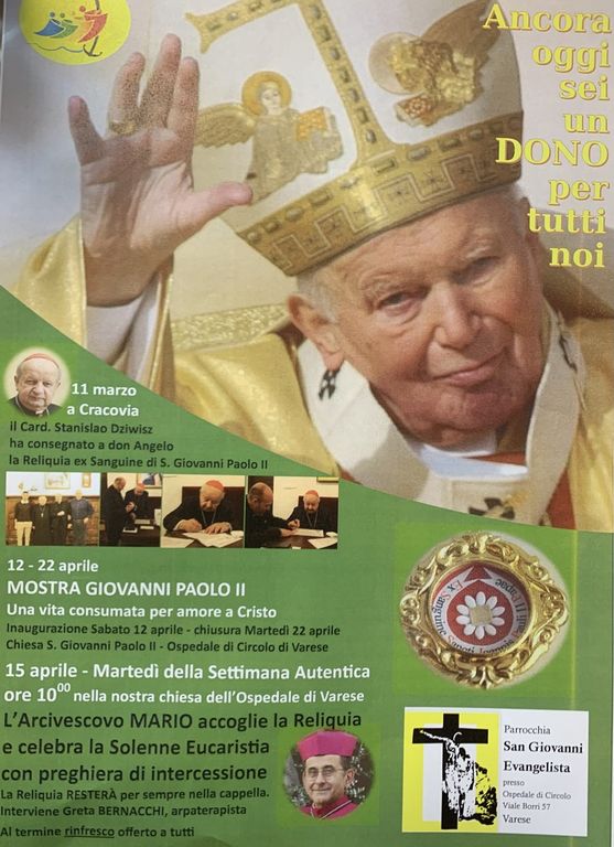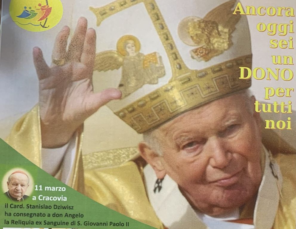 L’11 marzo scorso a Cracovia, il parroco don Angelo Fontana ha ricevuto dal cardinale Stanislao Dziwisz, ex segretario personale di San Giovanni Paolo II, una reliquia “ex sanguine” del santo.