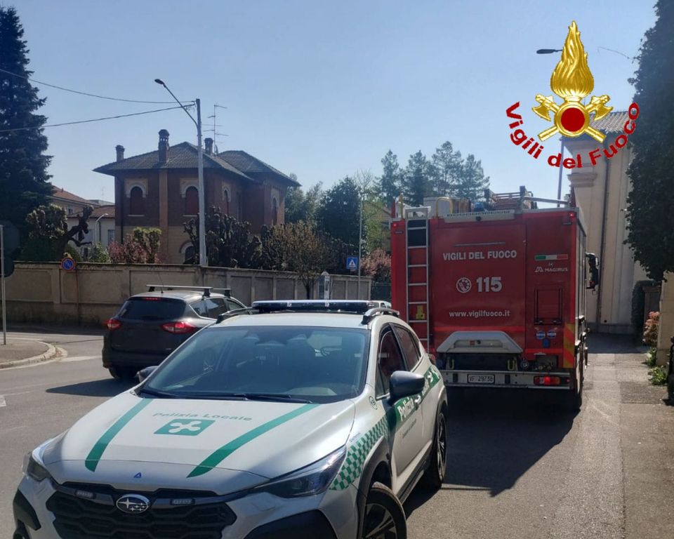 L'intervento dei vigili del fuoco e della polizia locale a Gallarate per il crollo di calcinacci in corso Sempione