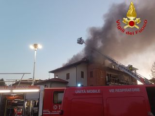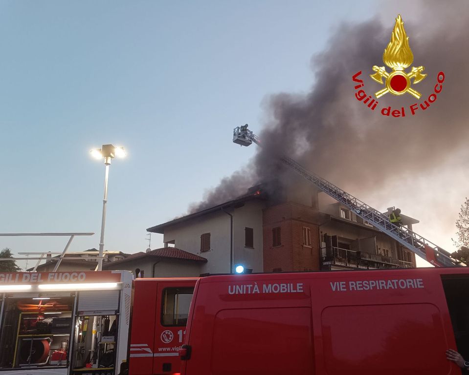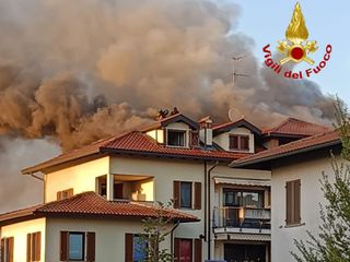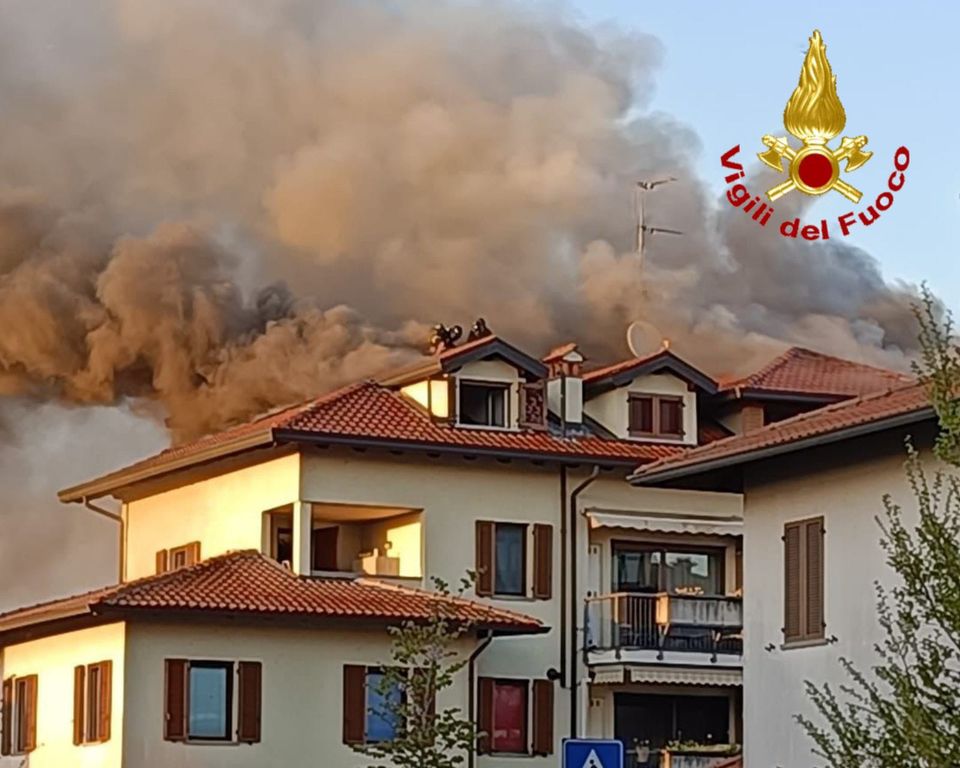 FOTO. Edificio di tre piani in fiamme a Cardano al Campo. Intervengono i vigili del fuoco