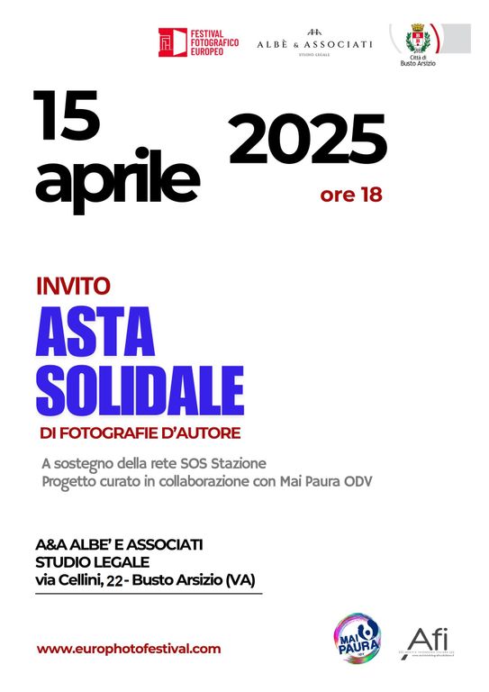 Asta solidale di fotografie d’autore a favore di SOS Stazione. L’iniziativa si terrà martedì 15 aprile alle ore 18 in A&A - Albè & Associati Studio Legale (via Cellini 22) a Busto Arsizio, nell’ambito del Festival Fotografico Europeo.
