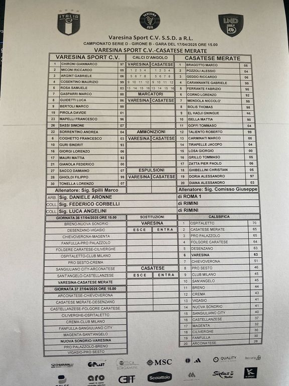 VARESINA-CASATESE 0-2 Rete ospite con un'inzuccata di Gningue contestatissima per il tocco di mano solare di Goffi prima del cross decisivo e un clamoroso fallo ospite non rilevato su Guri, svista che regala la rimessa dell'azione del gol alla Caratese.