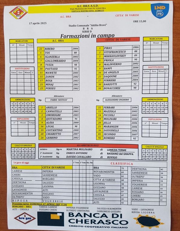 Bra (3-5-2): Ribero; Zanon (46′ st Quitadamo), Tos, Sganzerla; Mawete (27′ st Chiabotto), Giallombardo, Tuzza (20′ st Gerbino), Perseu (27′ st Legal), Pautassi; Minaj, Rosa (20′ st Aloia). A disp.: Ariello, Cannatelli, Omoregbe, Legal, Costantino. All.: Fabio Nisticò