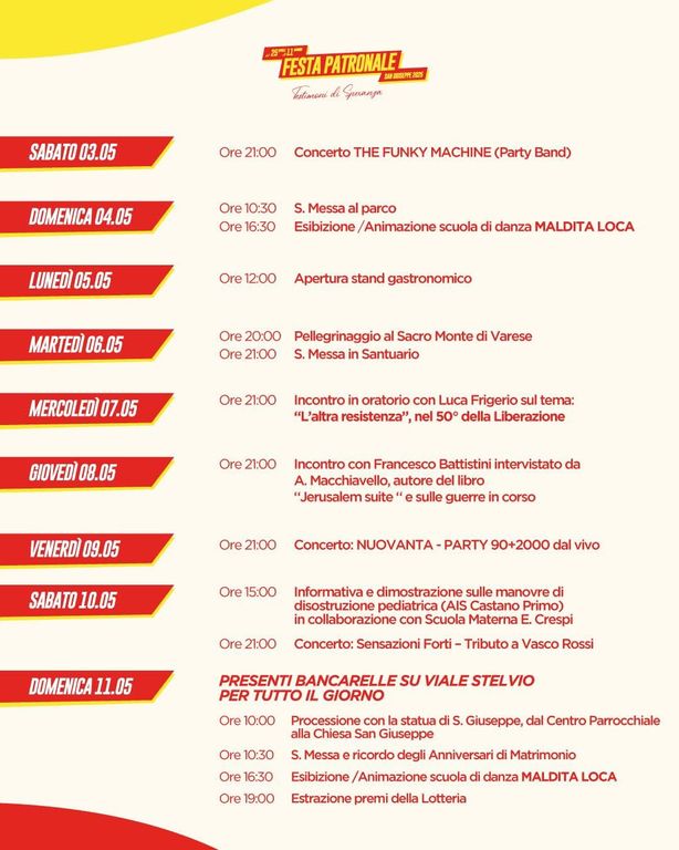 Venerdì 25 si parte alle 12 con lo stand gastronomico, sabato con il karaoke la sera e domenica alle 16.30 l'esibizione l'animazione per grandi e piccoli con la scuola di danza Maldita Loca. Poi un programma in crescendo tra musica, le bancarelle che compariranno in viale Stelvio giovedì primo maggio e per la conclusione domenica 11 maggio, le serate a tema come quella dedicata alla Pro Patria martedì 28 e una riflessione sul Medioriente e le guerre con Francesco Battistini intervistato da Angelo Macchiavello giovedì 8. Un incontro sottolineato da Cislaghi, quello di sabato 10 alle 15: informativa e dimostrazione sulle manovre di disostruzione pediatrica (Ais Castano Primo) in collaborazione con la scuola materna Crespi.