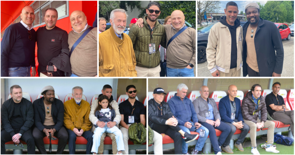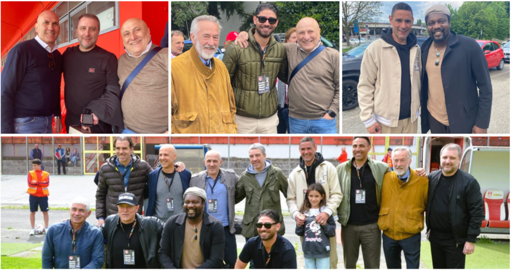 Dall'alto in senso orario Pertile con gli amici Mangia e Scapini, Frontini con Lazaar e lo stesso Scapini, la coppia Neto-Ebagua e, poi, il gruppone degli ex in campo nella foto di Ezio Macchi
