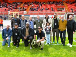 Dall'alto in senso orario Pertile con gli amici Mangia e Scapini, Frontini con Lazaar e lo stesso Scapini, la coppia Neto-Ebagua e, poi, il gruppone degli ex in campo nella foto di Ezio Macchi