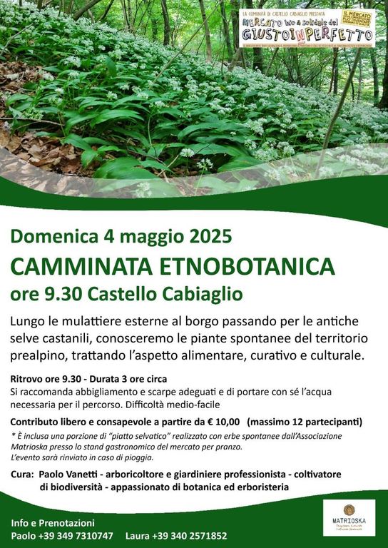 La primavera entra nei piatti dello stand gastronomico con menù di stagione a base di erbe spontanee, a conclusione della proposta mattutina di Camminata Etnobotanica nei dintorni boschivi del borgo a cura di Paolo Vanetti (posti limitati, prenotarsi al 3402571852).