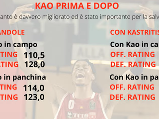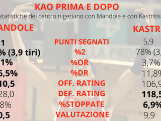 E domande, ovviamente, su chi vestirà la maglia biancorossa l’anno prossimo (minut0 39:40), con uno sguardo a chi è già sotto contratto per la prossima stagione: accordo garantito con Librizzi, Assui, Gray ed Esposito; accordo con clausola d’uscita con Alviti (in favore del giocatore) e Jordan Harris (in favore della società a basso costo). E a proposito di singoli, uno sguardo anche alle cifre di Akobundu-Ehiogu, e al confronto delle sue prestazioni con coach Mandole e coach Kastritis (immagini in fondo all’articolo).