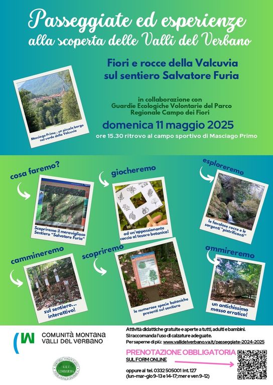 Una nuova passeggiata per famiglie, la terza, alla scoperta della Valli del Verbano: è in programma domenica prossima, 11 maggio, sul Sentiero “Salvatore Furia” a Masciago Primo ed è organizzata dalla Comunità Montana Valli del Verbano. L'escursione porterà i partecipanti, grandi e piccini, alla scoperta dei fiori e delle rocce della Valcuvia in collaborazione con le Guardie Ecologiche Volontarie del Parco Regionale Campo dei Fiori.