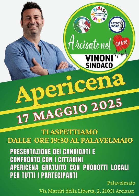 Sabato 17 maggio, dalle 19.30, il candidato sindaco Giacomo Vinoni sarà al PalaVelmaio di Arcisate per un evento speciale: un apericena gratuito con prodotti locali a km0, preparata con passione per valorizzare il nostro territorio.