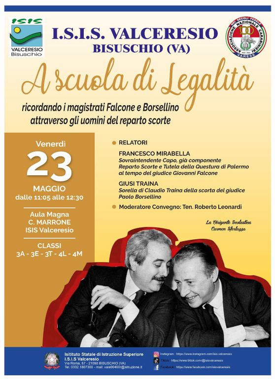 Ad incontrare gli studenti dell’istituto, nel giorno del trentatreesimo anniversario della strage di Capaci, saranno Francesco Mirabella, scorta del giudice Falcone, e Giusi Traina, sorella di Claudio, uomo della scorta morto nell'attentato al giudice Borsellino.