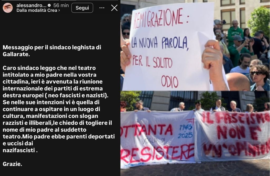 Il post è arrivato dopo il clamore mediatico seguito al Remigration Summit tenutosi sabato scorso, 17 maggio, al Teatro Condominio Vittorio Gassman di Gallarate. E porta la firma di Alessandro Gassmann, attore e regista di fama, nonché figlio del grande Vittorio, al quale il teatro comunale di Gallarate è intitolato. Un messaggio durissimo, rivolto direttamente al sindaco Andrea Cassani (Lega).