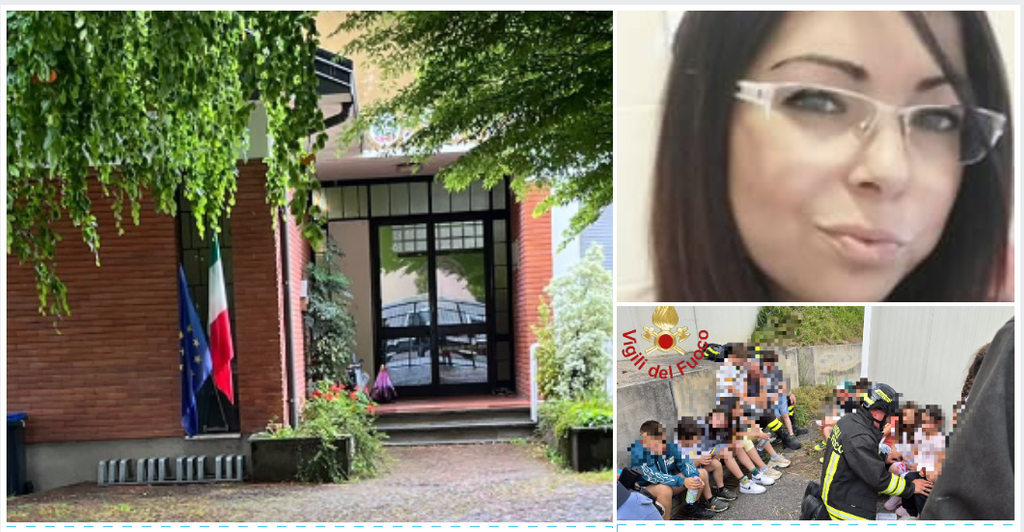 A sinistra: la scuola primaria Pascoli di Cazzago Brabbia. Nei riquadri la vittima Domenica Russo e alcuni bambini messi in sicurezza dai vigili del fuoco durante le operazioni di soccorso