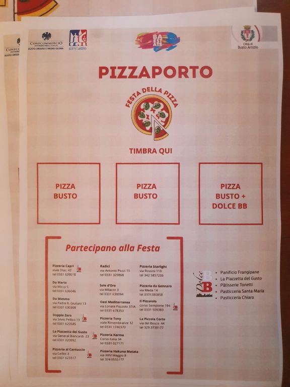 Il format è confermato: i locali aderenti proporranno la Pizza Busto, per metà calzone (con un ripieno “a sorpresa” scelto da ciascun proponente) e per l’altra metà pizza farcita con pomodoro e mozzarella. Il prodotto sarà a forma di B e i colori saranno quelli della città: il rosso del pomodoro e il bianco della mozzarella.