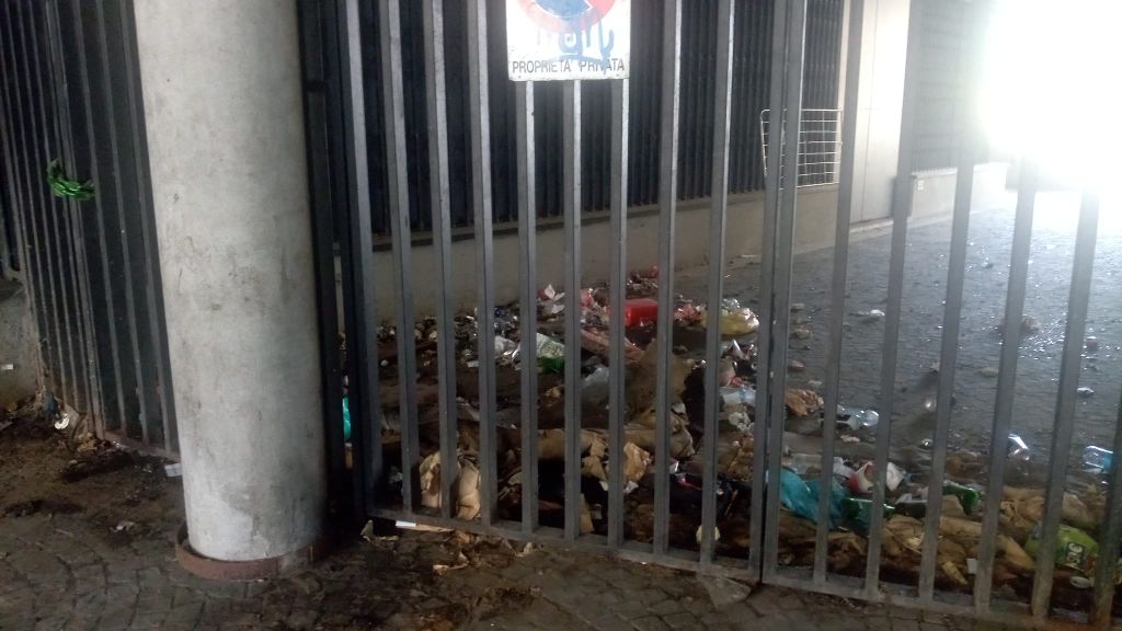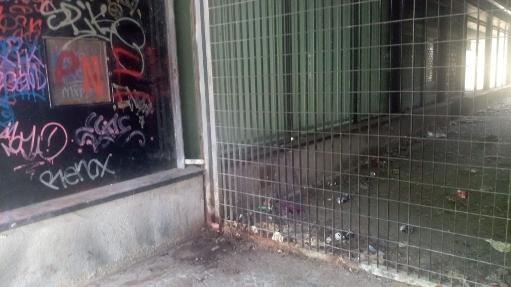 Più di un anno fa si era esposto il problema, vista la presenza di cuscini bruciati, vetri rotti, rifiuti, pezzi di marciapiedi rotti (Leggi QUI). A oggi, poco o niente è cambiato: il cemento è stato tolto, così come la maggior parte dei rifiuti ma, nel frattempo, altra spazzatura si è accumulata, soprattutto all'interno dei cancelli, e il cattivo odore persiste. I graffiti imbrattano ancora le vetrine, tranne che per una dove è stato posizionato del materiale nero e il tutto è stato chiuso da un lucchetto. Un citofono, poi, è stato completamente distrutto con i cavi lasciati a penzolare in bella vista.