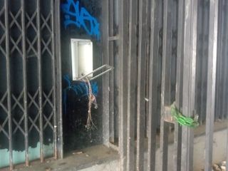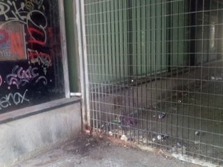 Più di un anno fa si era esposto il problema, vista la presenza di cuscini bruciati, vetri rotti, rifiuti, pezzi di marciapiedi rotti (Leggi QUI). A oggi, poco o niente è cambiato: il cemento è stato tolto, così come la maggior parte dei rifiuti ma, nel frattempo, altra spazzatura si è accumulata, soprattutto all'interno dei cancelli, e il cattivo odore persiste. I graffiti imbrattano ancora le vetrine, tranne che per una dove è stato posizionato del materiale nero e il tutto è stato chiuso da un lucchetto. Un citofono, poi, è stato completamente distrutto con i cavi lasciati a penzolare in bella vista.