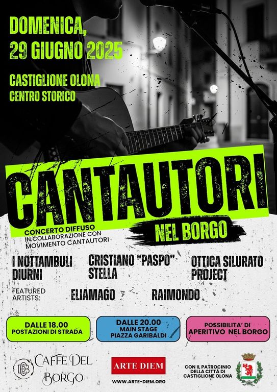 L’associazione Arte Diem, da 21 anni presente sul territorio varesino, in collaborazione con “Movimento Cantautori” presenta la 1a edizione di “Cantautori Nel Borgo”, che si terrà domenica 29 giugno 2025 a partire dalle ore 18.00 nel centro storico di Castiglione Olona.