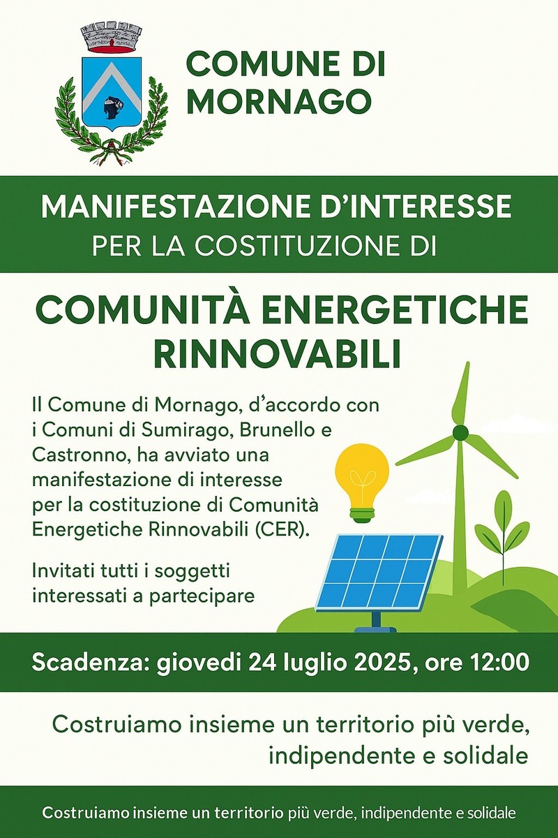 Il comune di Mornago, in collaborazione con i comuni di Sumirago, Brunello e Castronno, ha avviato una manifestazione di interesse per la costituzione di Comunità Energetiche Rinnovabili (CER), un’iniziativa innovativa per promuovere la produzione e condivisione locale di energia da fonti rinnovabili. Queste comunità rappresentano una risposta concreta alle sfide climatiche ed energetiche attuali, contribuendo alla riduzione delle emissioni di CO₂, al rispetto dell’ambiente e a un significativo risparmio economico in bolletta per cittadini, imprese ed enti pubblici.